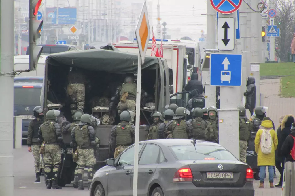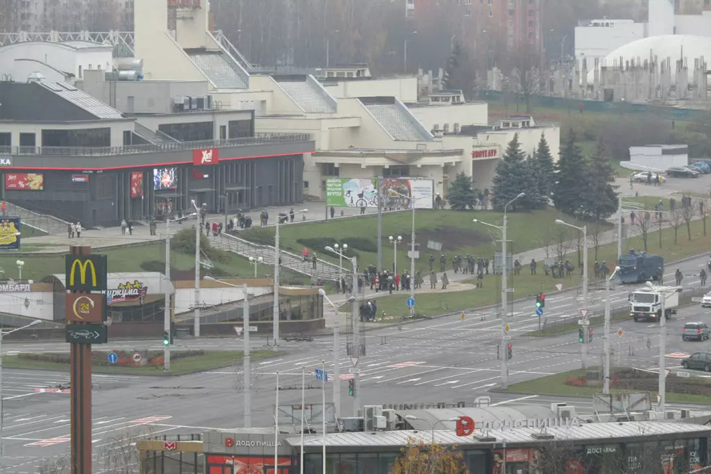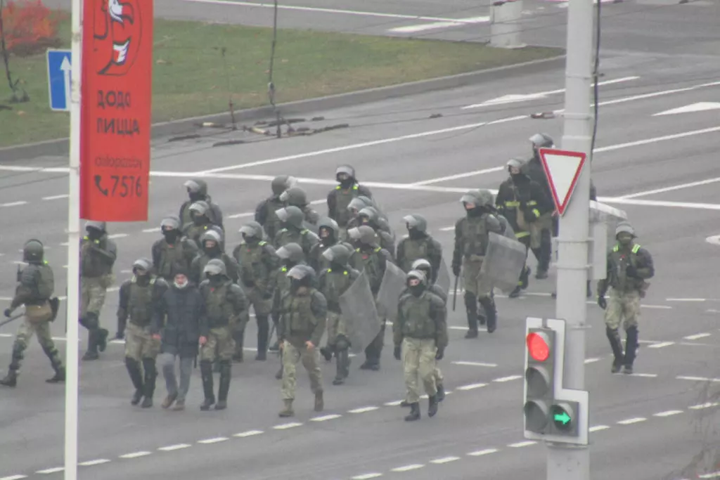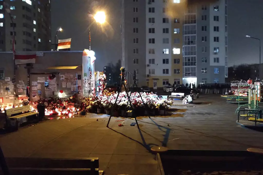 Внутренние войска прочесывают прилегающую к Пушкинской площади местность в поисках протестующих. Фото: Елена Боровская для «МБХ медиа»Силовики перегородили дорогу возле мемориала Александру Тарайковскому. Фото: Елена Боровская для «МБХ медиа»Локальные задержания на Пушкинской площади. Фото: Елена Боровская для «МБХ медиа»Водомет возле Пушкинской площади. Фото: Елена Боровская для «МБХ медиа»Люди у мемориала Александра Тарайковского показывают знак победы проезжающим мимо и сигналящим им машинам. Фото: Елена Боровская для «МБХ медиа»Сотрудники Внутренних войск залезают в грузовики перед переброской на Площадь Перемен с Пушкинской площади. Фото: Елена Боровская для «МБХ медиа»Фотография Романа Бондаренко. Пушкинская площадь. Фото: Елена Боровская для «МБХ медиа»Большой отряд сотрудников Внутренних войск ведет задержанного мужчину. Пушкинская площадь. Фото: Елена Боровская для «МБХ медиа»Стикеры на станции метро Пушкинская возле мемориала. Фото: Елена Боровская для «МБХ медиа»Мемориал Александра Тарайковского на Пушкинской площади, 15 ноября 2020 года. Несмотря на разгон, женщины возвращаются, люди приносят свежие цветы. Фото: Елена Боровская для «МБХ медиа»БКБ-флаг на одном из домов в Минске, недалеко от Площади Перемен. Фото: Елена Боровская для «МБХ медиа»Захваченный силовиками мемориал погибшего Романа Бондаренко на Площади Перемен. Фото: Елена Боровская для «МБХ медиа»Работники коммунальных служб под присмотром ОМОНа приступили к «уборке» мемориала, они снимают красно-белые ленточки с забора. Фото: Елена Боровская для «МБХ медиа»Убившие Романа Бондаренко 11 ноября неизвестные приезжали на Площадь Перемен именно для того, чобы срезать эти ленточки. Фото: Елена Боровская для «МБХ медиа»Мемориал Бондаренко. Силовики пообещали уничтожить его к утру. Фото: Елена Боровская для «МБХ медиа»Сотрудники Внутренних войск в амуниции и со щитами блокируют Площадь Перемен по периметру. Бондаренко несколько лет назад тоже служил в военной части ВВ 3214. Фото: Елена Боровская для «МБХ медиа»Лампадки на Площади Перемен. Местные жители пообещали, что завтра восстановят мемориал, как только силовики уйдут. Фото: Елена Боровская для «МБХ медиа»Next post