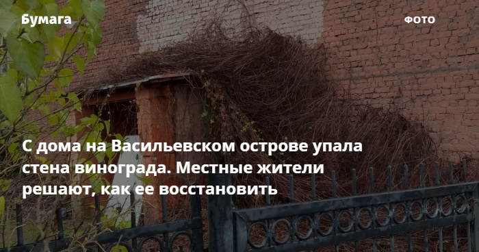 Фотографии упавшего растения опубликовали 14 ноября. Местный житель рассказал «Бумаге», что видел упавший виноград еще 10 сентября — вскоре после сильного ветра на острове. На снимке, опубликованном в группе «От Стрелки до Гавани», стена винограда выглядит усохшей.