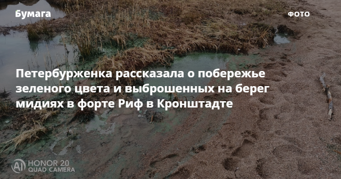 Петербурженка Марина Мацкевич обнаружила участок побережья зеленого цвета в форте Риф, который усыпан мидиями и ракушками. Об этом она сообщила изданию «Северо-Запад. МБХ медиа».
