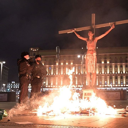 Студент первого курса РУДН 20-летний Павел Крисевич поздно вечером 5 ноября 2020 года в самом центре Москвы — в 150 метрах от здания ФСБ на Лубянке — привязал себя к кресту в позе Христа, товарищи бросили к его ногам папки, отсылающие к томам политических уголовных дел последних лет, и подожгли их «веществом, которое горит при 40℃ и не наносит человеку вреда».