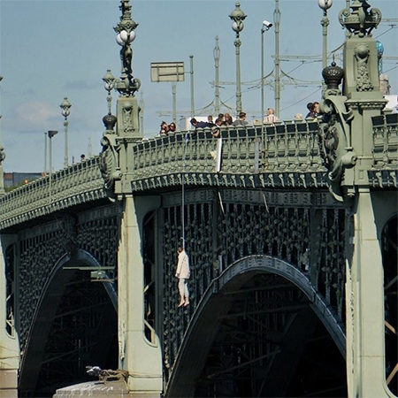Подвешивание на Троицком мосту я устраивал в поддержку российских политзаключенных и в поддержку задержанных на митингах в Белоруссии. То, что у них в Окрестина творилось, — это п∗∗∗ец полнейший, ментовской беспредел. Вишу на мосту, подплывает частный катер, на нем мужики средних лет. Сфоткали, спросили: «Зачем висишь?» — «Вишу в поддержку политзаключенных!» — «Ну и дурак!» Они видят, что человек что-то нестандартное сделал, и сразу: «Дурак, на х∗я? Можно же бухать». Потом их ролик попал на «Фонтанку».