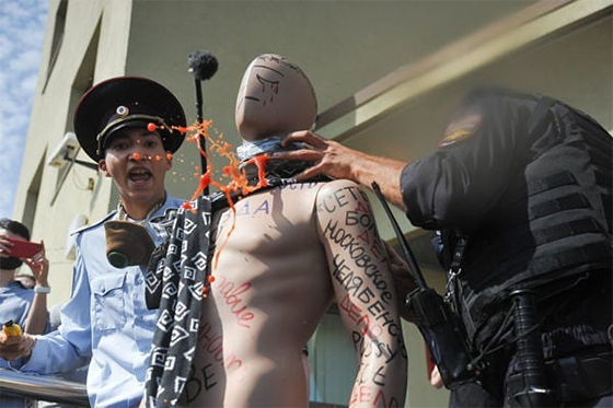 После наручников был перформанс с манекеном на ступенях Люблинского суда в Москве во время приговора ребятам из «Нового величия» 6 августа. Акция была в поддержку политических заключенных. Мне запомнились слова Руслана Костыленкова (фигуранта дела «Нового величия», получившего семь лет лишения свободы в колонии общего режима. — Ред.). Он до приговора говорил, что, если ему дадут срок, он поступит по кодексу чести самурая. Ну, ему другого не остается. Государство его почти раздавило. Если сейчас апелляция не пройдет, он не будет до конца сидеть. У человека жизнь разрушена — семь лет в тюрьме, не должен человек ни за х∗∗ столько сидеть. Он вскроется, там такое начнется. Человек будет мертвым, но поможет другим. Дело по-любому на пересмотр кинут и всех выпустят. Жертвенность должна быть. Если бы мне столько же дали, я бы так же сделал.