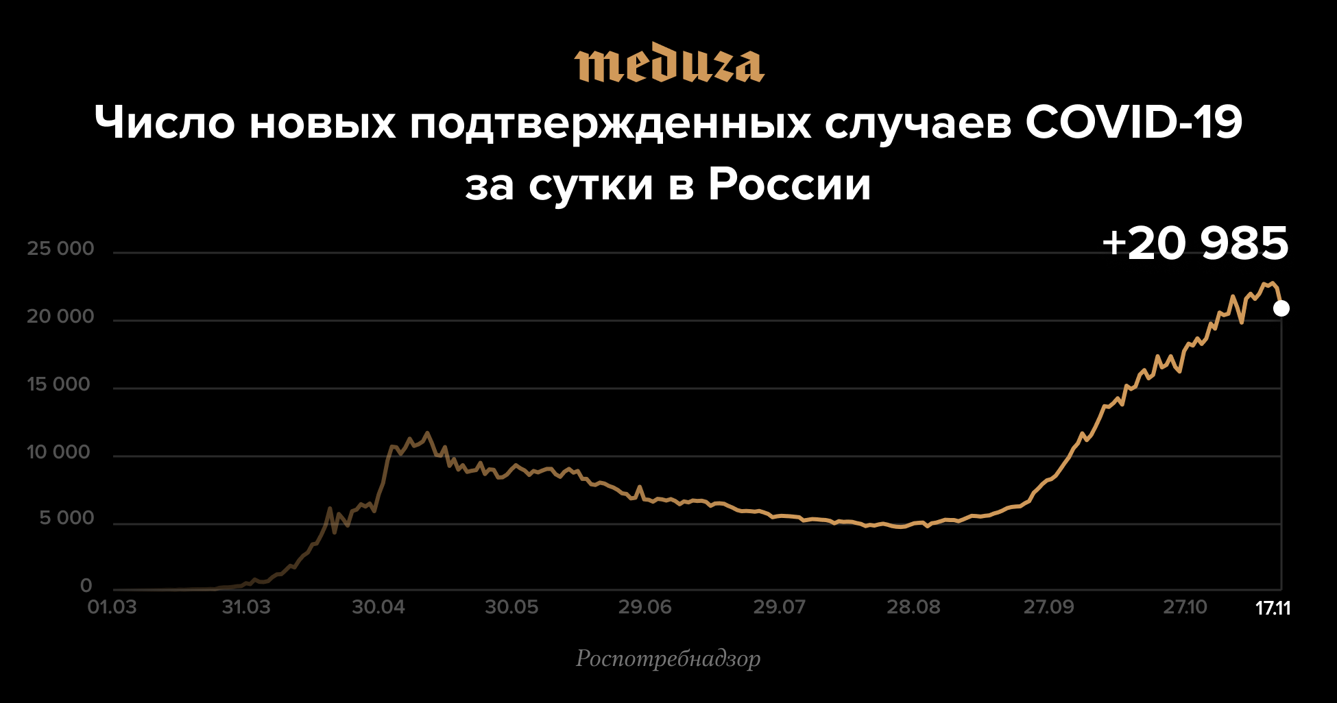В России за сутки умерли 456 человек с COVID-19 — это максимум за все время пандемии. Предыдущий рекорд (442 человека) был вчера. Всего умерли 34 387 человек. За сутки в стране выявили 20 985 новых случаев коронавируса. Всего с начала пандемии в стране заболели 1 991 998 человек. За сутки из больниц выписали 25 179 пациентов с ковидом. Впервые с 16 сентября выздоровевших оказалось больше, чем новых заразившихся. За все время выздоровели 1 501 083 человека.