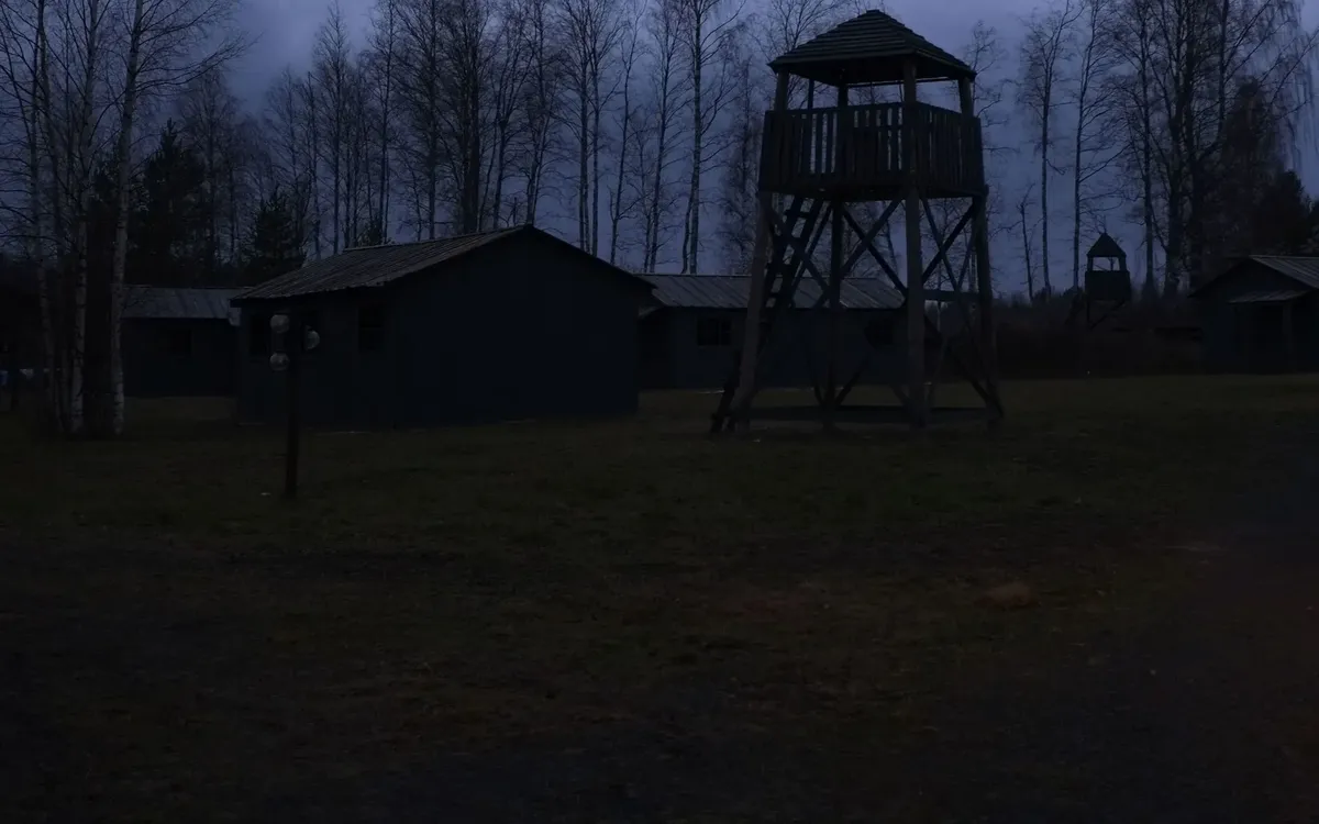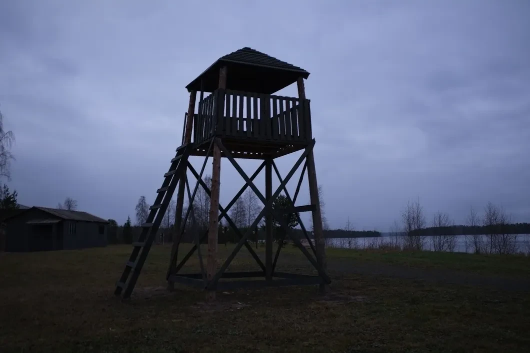 Темнеет рано, и в какой-то момент площадка скрывается в сумраке. Только что мы миновали аккуратные постройки турбазы, справа дном вверх отдыхают лодки, не убранные еще на зиму, тут бы вечером жечь костер да в полдень запускать змея. Но в 50 метрах царит смертный ужас. Ладные вышки собраны качественно, хоть сейчас выставляй надзирателей. Наташа рассказывает, как искала по знакомым старые одеяла и тряпки — бросить на нары, чтобы не смотрелось новьем. Достает из мешка ватник. В бараке холод и тьма; электричества, говорит Наташа, не будет, ведь не было же его тогда. А еще обижается на заголовки коллег: мол, школьникам предложат переночевать в концлагере. Не в лагере же, а рядом, в нормальных теплых номерах…