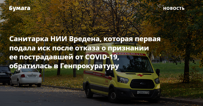 В своем обращении санитарка подчеркивает, что с 2017 года в центре Вредена в ее обязанности, в частности, входили подача пациентов в операционный блок, их перемещение из реанимации в общие палаты и оказание помощи. Александрова требует обязать руководство учреждения выдать акт о признании ее пострадавшей от COVID-19.