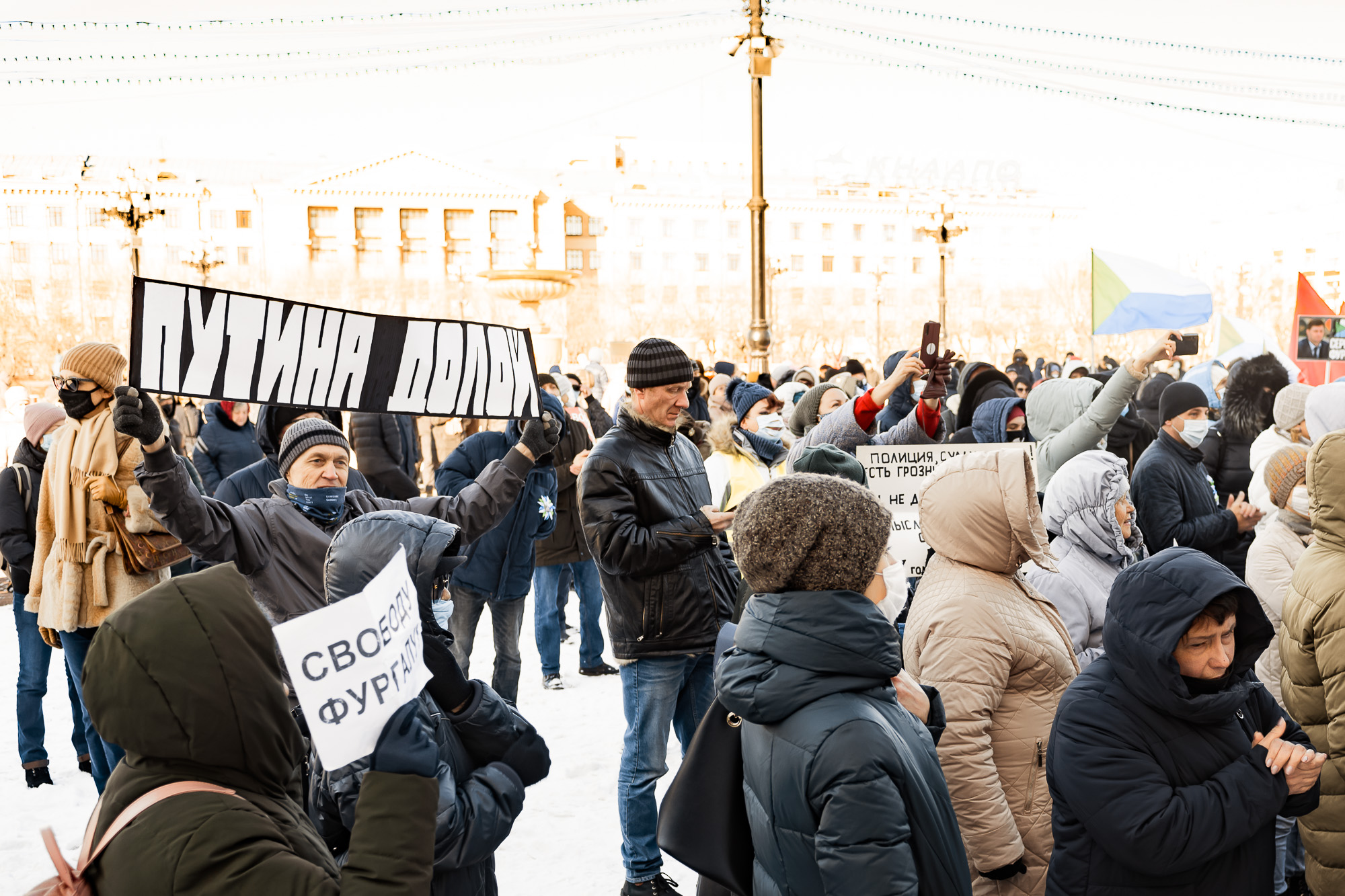 - Протесты в Хабаровске продолжаются более четырёх месяцев. Их участники требуют справедливого разбирательства дела экс-губернатора Сергея Фургала. Поскольку власть не отреагировала на массовые протесты, жители стали выдвигать политические требования, в том числе отставки президента Владимира Путина.