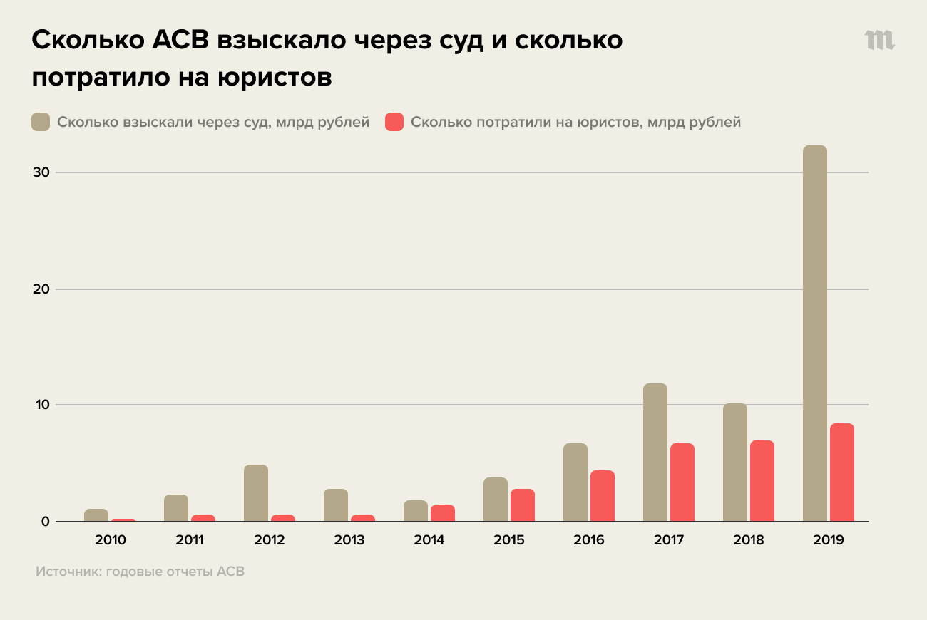 Эффективность работы привлеченных агентством юристов и торговых площадок можно оценить по годовому отчету госкорпорации. В 2019 году АСВ взыскало с должников через суды 32,4 миллиарда рублей, потратив на юридическое сопровождение 8,5 миллиарда рублей (39% всех расходов — на конкурсное производство).