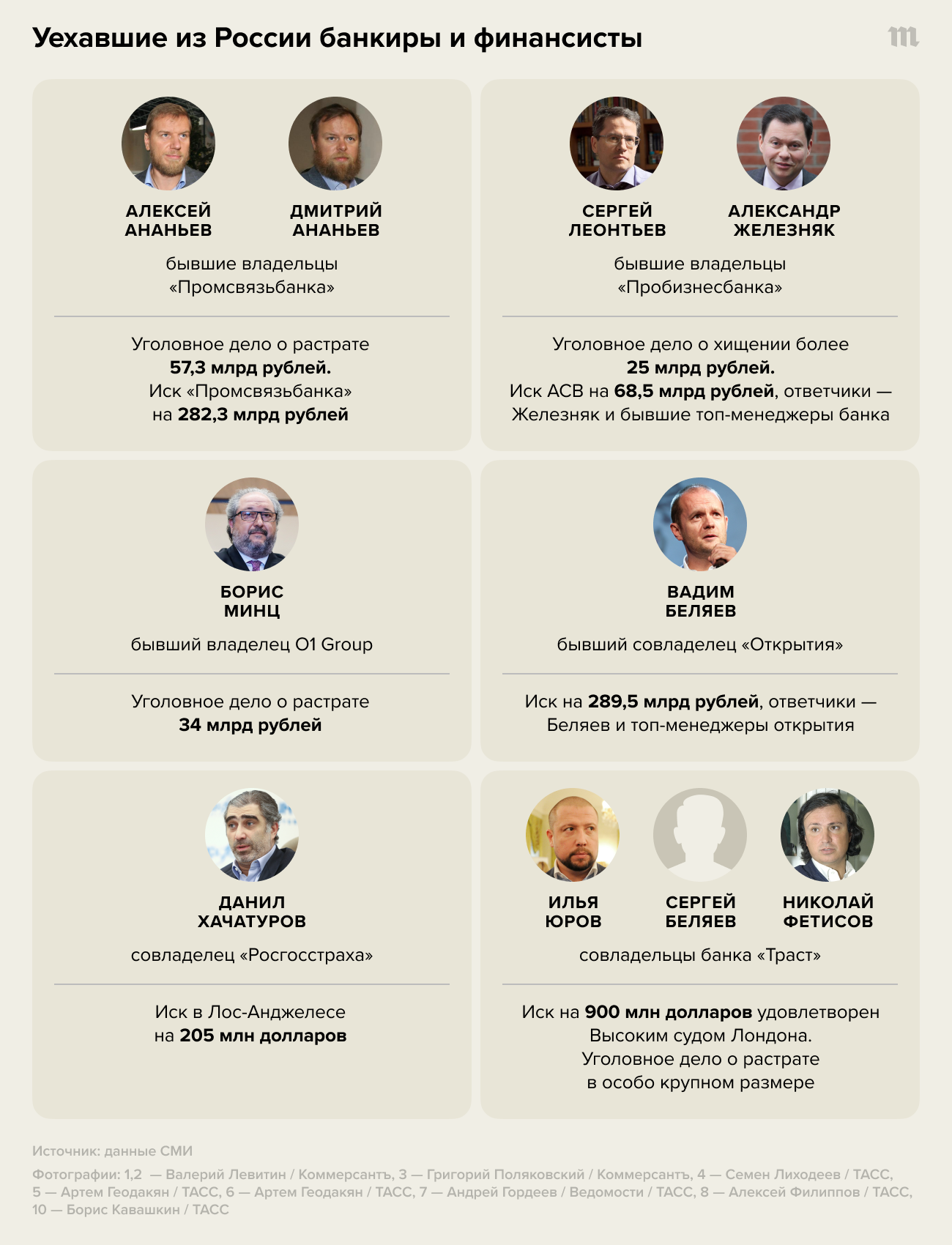 С тех пор многие крупные банкиры и финансисты из-за проблем с бизнесом уехали из страны. Почти все они стали фигурантами уголовных дел и ответчиками по искам на сотни миллиардов рублей.