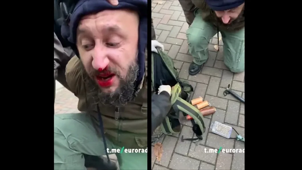 Мужчина отвечал, что пришел поддержать протестующих, что его поступок был эмоциональным и что задержали его на бульваре Шевченко. На видео отчетливо видно, что говорить мужчине тяжело, при этом прямо на камеру силовики достают из его рюкзака дымовые шашки, дубинку, рогатку, балаклаву, стальные шарики, самодельные петарды.