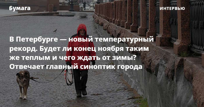 В ночь на 19 ноября в Петербурге зафиксировали температурный рекорд: воздух прогрелся до +10,9 градуса. Последний раз так тепло в городе было в 1978 году. Ждать ли от ноября аномальных температур в дальнейшем и какой в этом году будет зима? «Бумага» поговорила с главным синоптиком города Александром Колесовым.