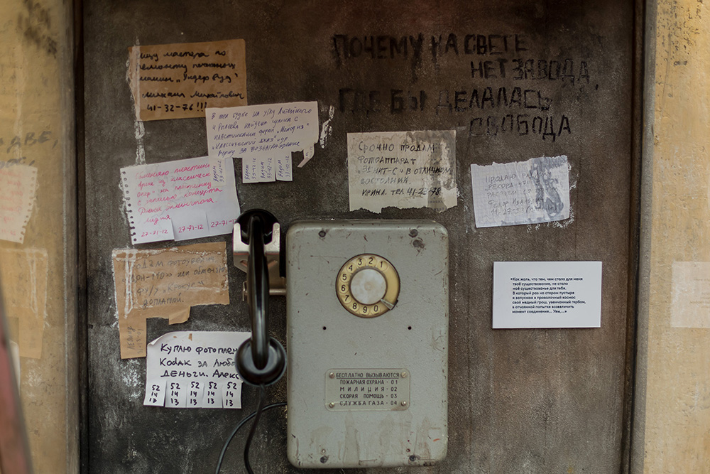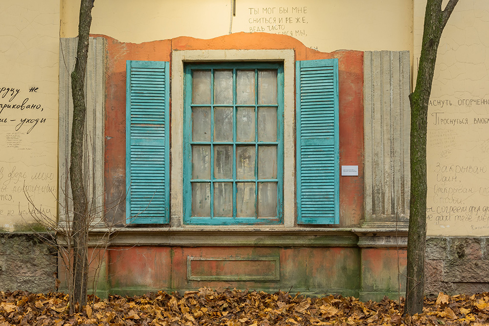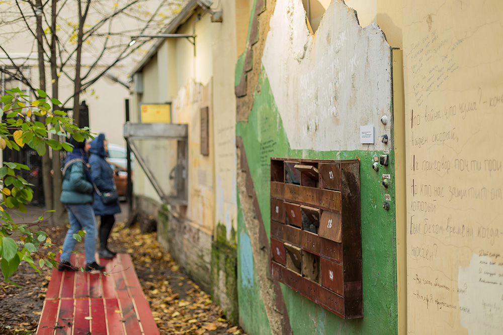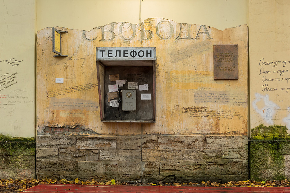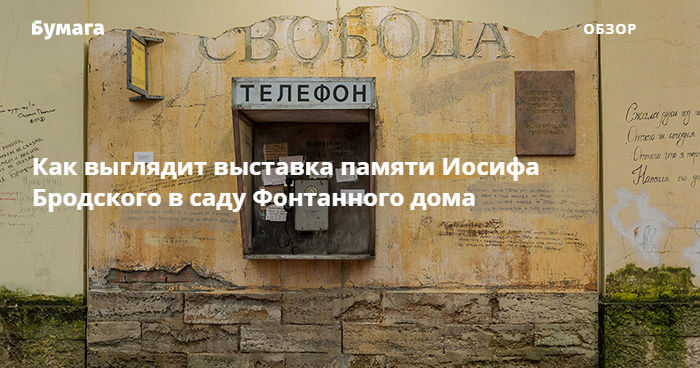 «Сохрани мою тень» работает под открытым небом: на одной из садовых стен воссоздали личное пространство Иосифа Бродского и предметы его эпохи. Всё начинается с телефонной будки, над ней — слегка истершееся слово «Свобода» и табличка с номером 47-го автобуса (он шел прямо к дому поэта — выше по Литейному).