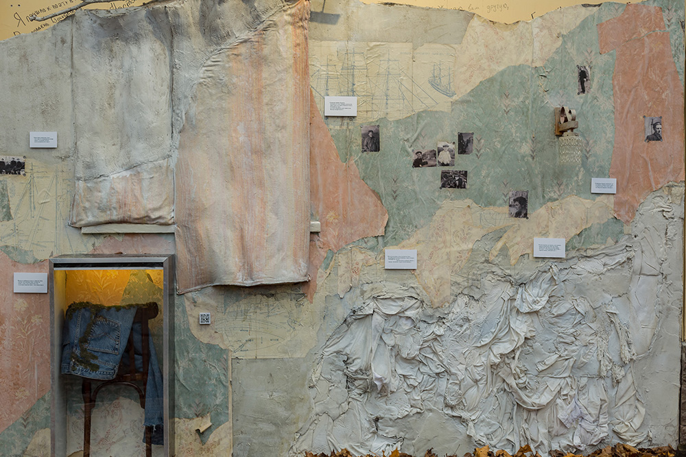 Следующие фрагменты стены отражают другие, символичные для коммунальной квартиры, пространства. В «коридоре» представлены почтовые ящики, на всех — номер 28 (это номер квартиры в доме Мурузи, где жил поэт). Внутри лежат телеграммы, конверты с иностранными марками или опавшие листья. В «кабинете» — «вросшие» в стену стол и настольная лампа. В «спальне», оформленной в голубых и розовых тонах, выставлены голубые джинсы, покрытые слоем мха, — как символ давно прошедшей юности.