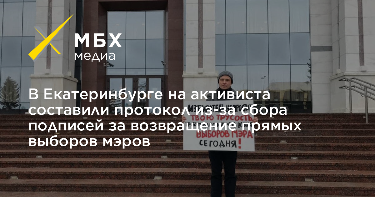 В Екатеринбурге активист Алексей Гресько получил по почте протокол о нарушении установленного порядка проведения акции (ч. 5 ст. 20.2 КоАП) из-за сбора подписей за прямые выборы мэров в Свердловской области. Об этом «МБХ медиа» сообщила пресс-секретарь «Народной инициативы» Ирина Саломатова.