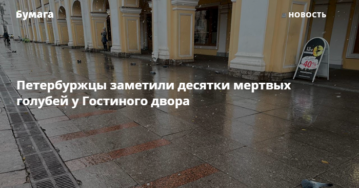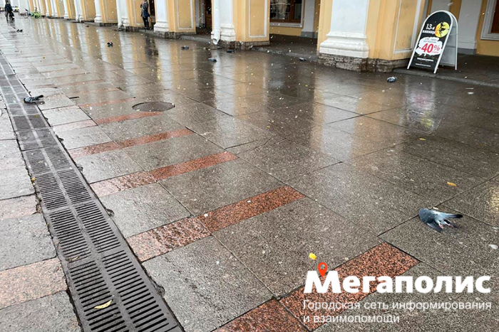«Мегаполис» пишет примерно о 15 мертвых голубях. По данным издания, они были разбросаны по тротуару Невского проспекта и внутри галереи Невской линии Гостиного двора.
