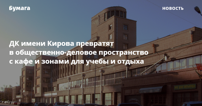 Петербургский ДК имени Кирова, который находится между Большим и Средним проспектами Васильевского острова, превратят в общественно-деловое пространство для работы и отдыха. Об этом «Бумаге» сообщили в компании «Агора. Гастроурбанистика», которая будет заниматься проектом.