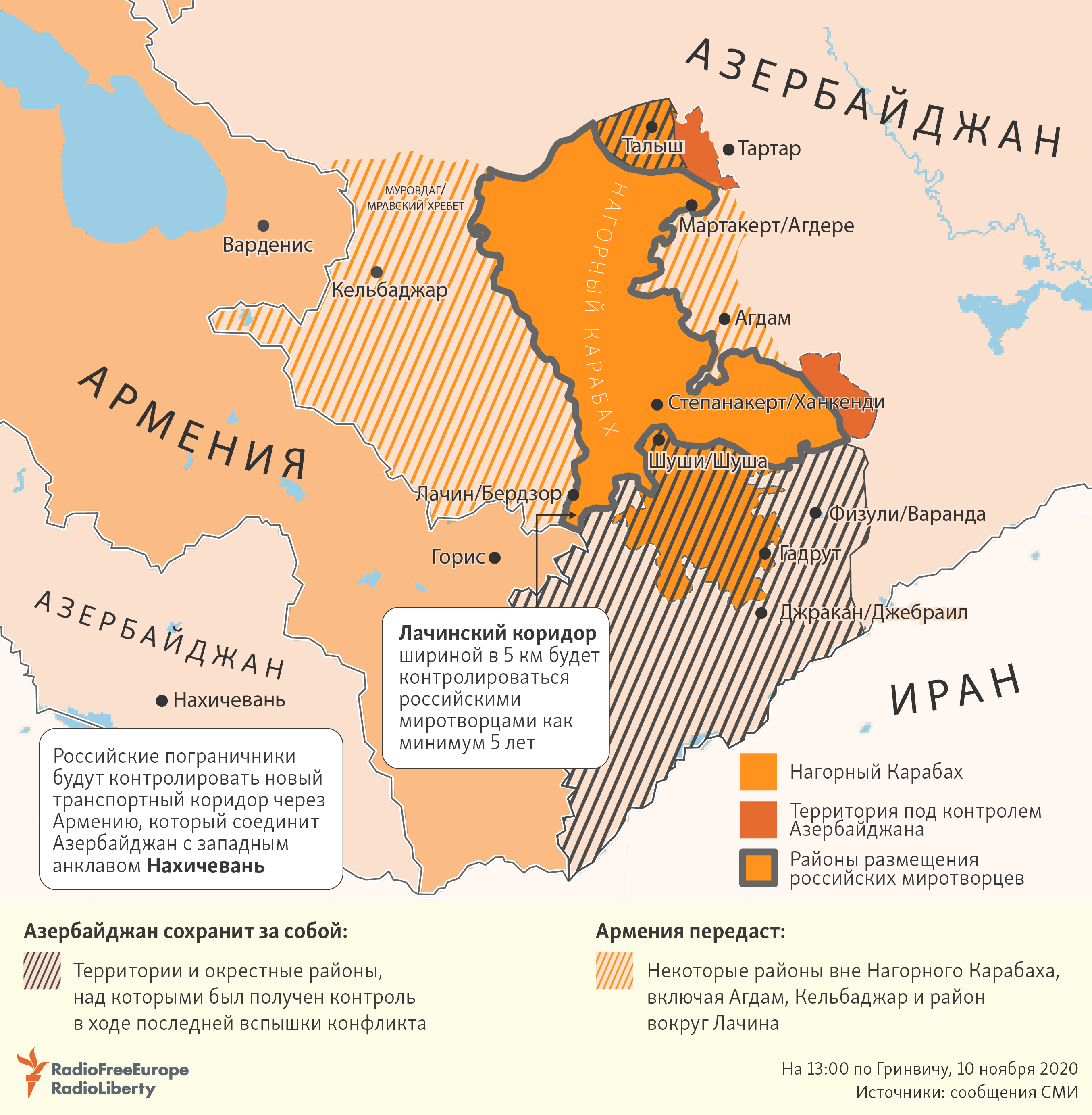 - Договорённости стали итогом успешных для Азербайджана боевых действий, в ходе которых был, в частности, занят ключевой город Шуша и ряд райцентров по периметру Карабаха.