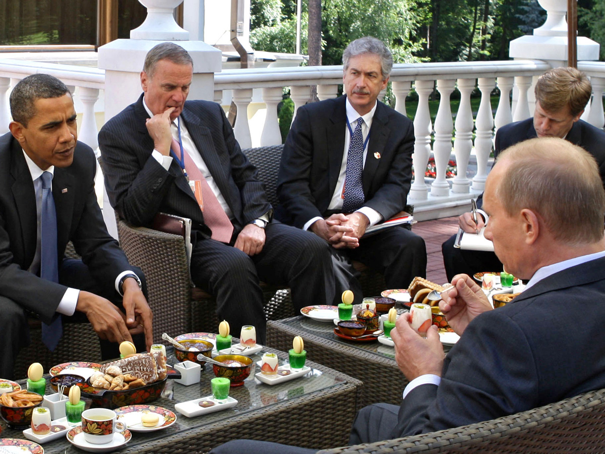 Вторым и главным событием той поездки была встреча в Ново-Огарево с Владимиром Путиным, занимавшим пост председателя правительства. Премьер принял президента на открытой веранде за "изысканно сервированным", как выражается Барак Обама, столом. Президенту, как и многим журналистам, запомнился мужчина в русском народном костюме, раздувающий сапогом самовар.