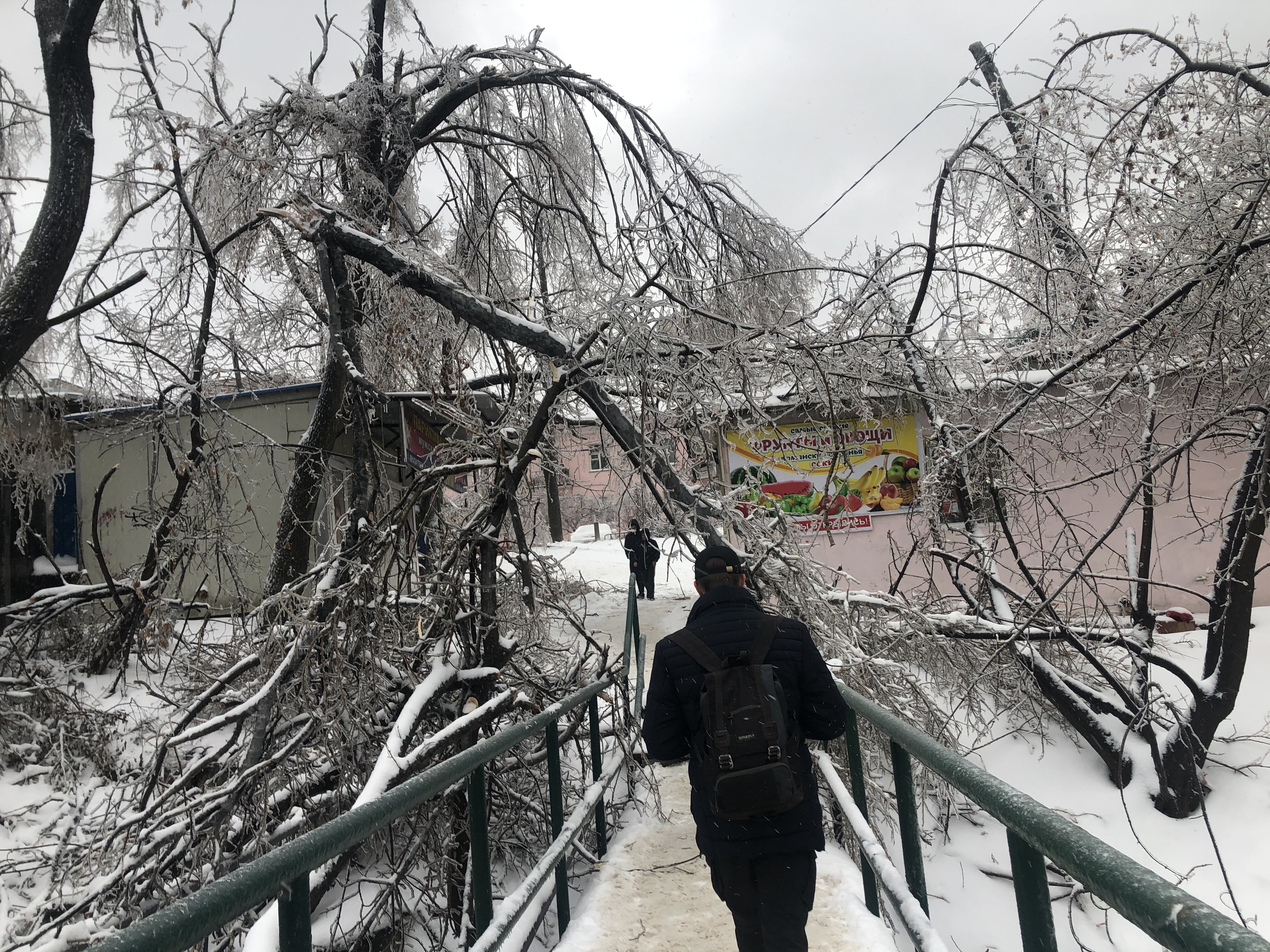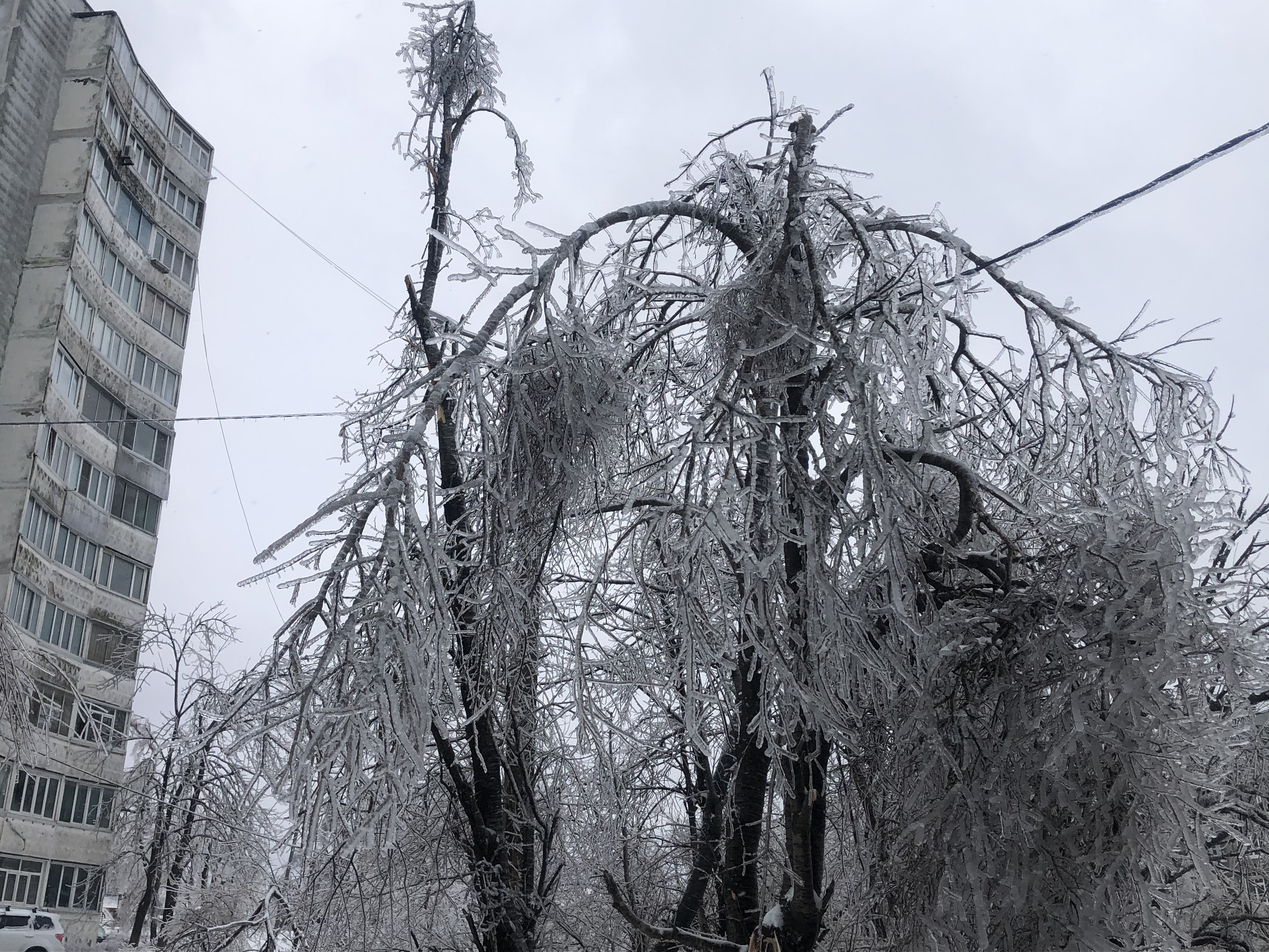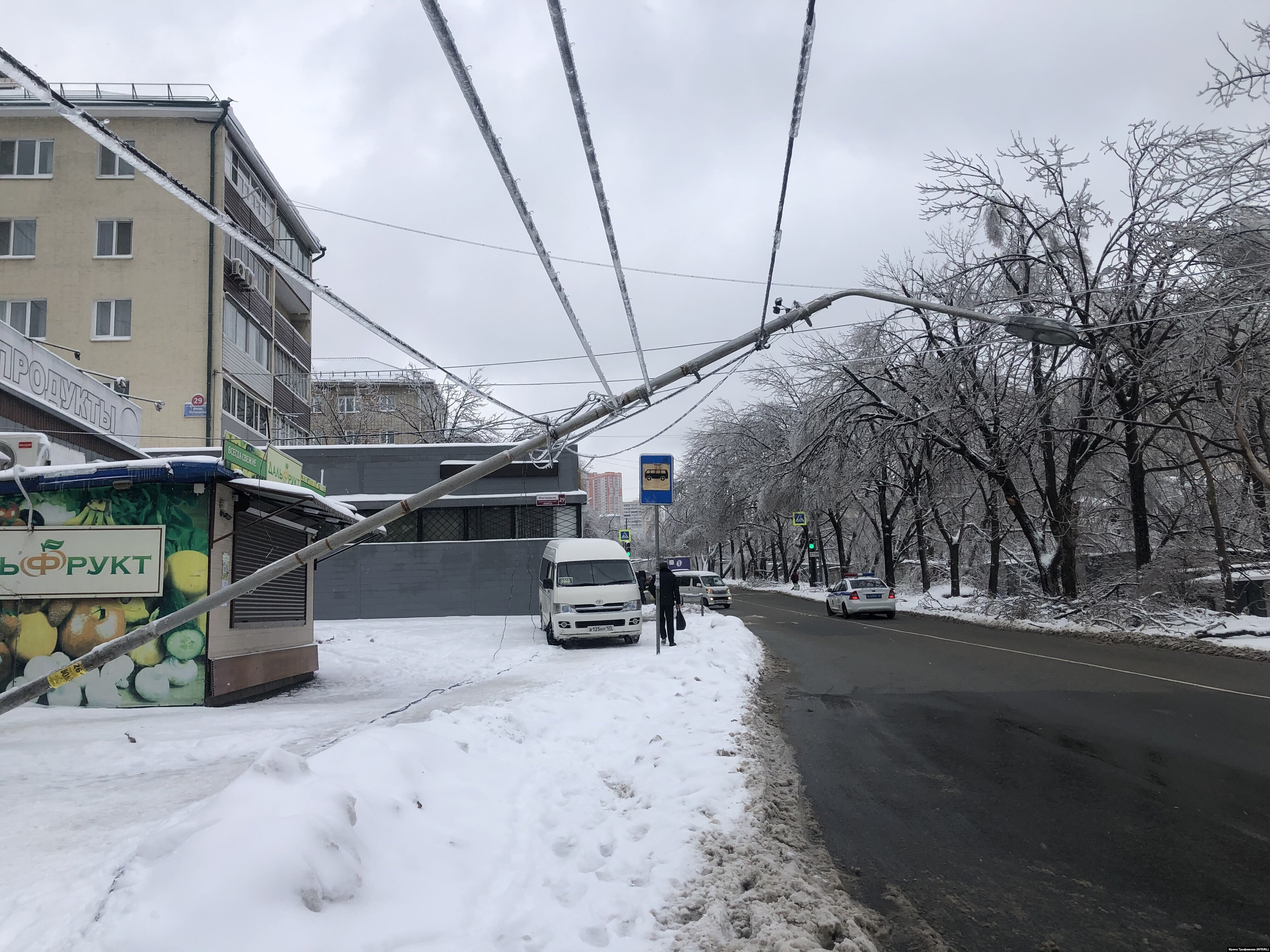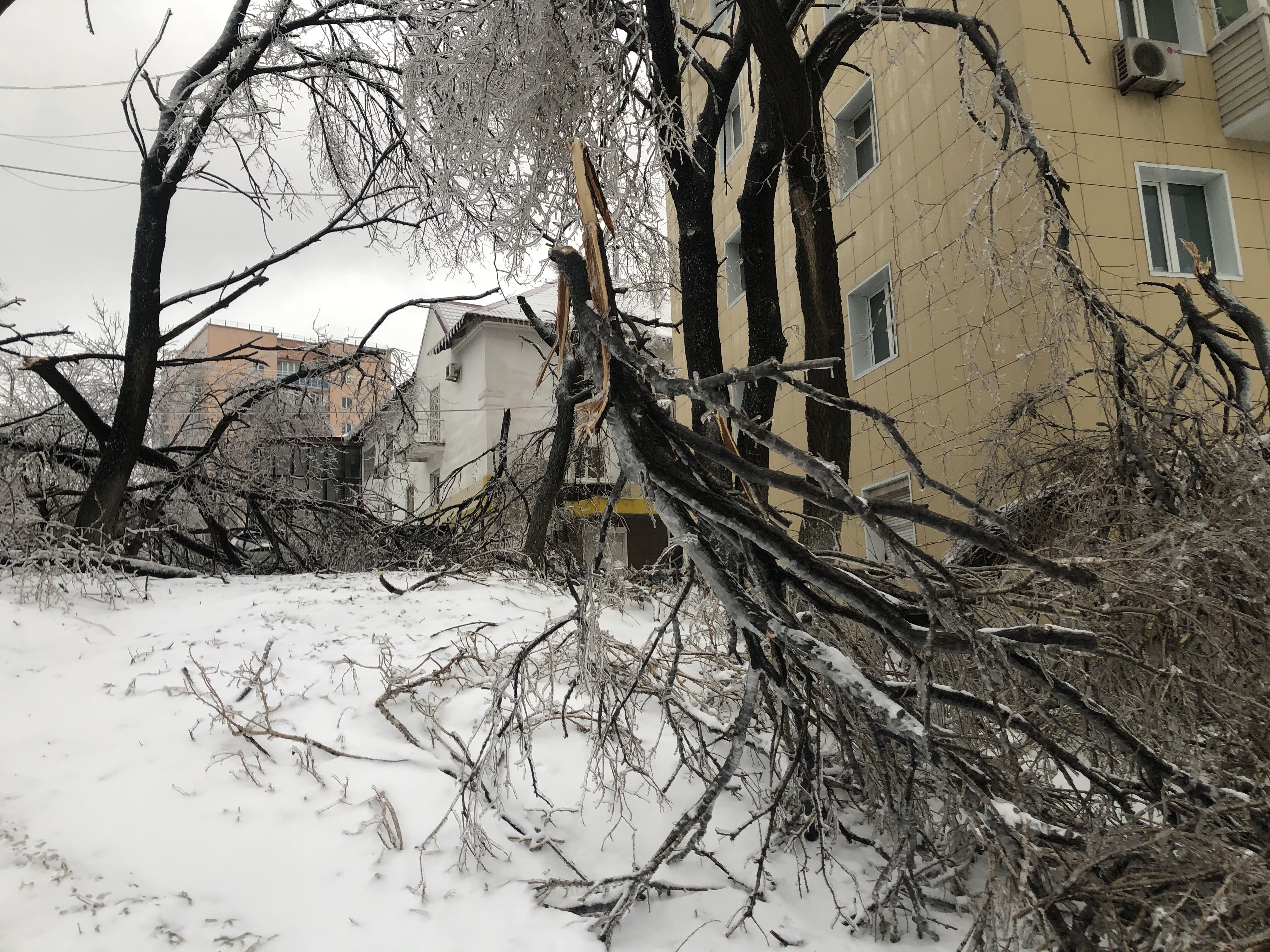 Накануне, после ноябрьских ледяных ливней, весь Владивосток проснулся, как будто облитый сахарной глазурью. Подо льдом оказалось все: крыши домов, автомобили, дороги, электрические провода. Синоптики зафиксировали толщину обледенения в 12 мм. Такого в Приморье не было уже 30 лет. К утру пятницы в городе сломаны большинство деревьев. Стволы и ветки не выдерживают веса льда.