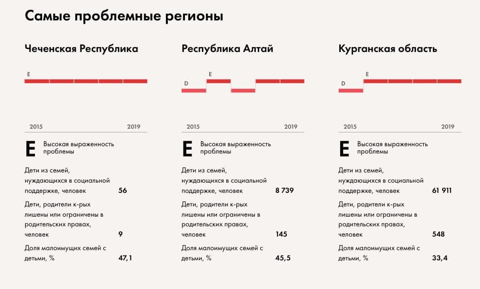 Антилидерство в этом рейтинге у Чечни, Алтая, Курганской области, Еврейской автономной области и у Тывы. По данным «Если быть точным», в Чечне самый высокий уровень детской инвалидности, самая маленькая доля детей, посещающих дополнительные образовательные занятия, и самая высокая доля малоимущих домохозяйств с детьми в стране.