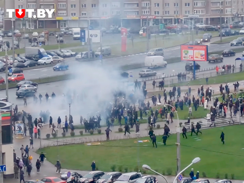 "В районе Каменной Горки против демонстрантов применили спецсредства", - сообщает белорусский портал tut.by, который опубликовал видеозапись происходящего. Слышны взрывы, виден дым, как от светошумовых гранат.