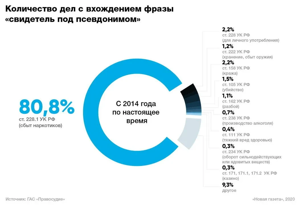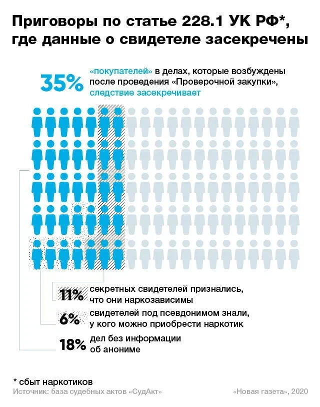 В 80% случаев тайный свидетель выступает в делах за сбыт наркотиков. Дата-отдел изучил более ста приговоров по статье 228.1 УК, где данные о свидетеле засекречены. В каждом разбирательстве аноним — участник операции «проверочная закупка». В сговоре со следствием, согласно инструкции проведения ОРМ (оперативно-разыскное мероприятие), он приобретает у подозреваемого наркотик, после чего показания доносчика (а иногда и провокатора) становятся стержнем обвинительного приговора.