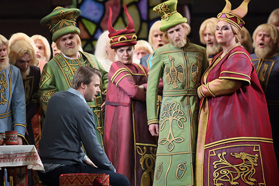 Из плоскости — в объем: Черняков и Пикалова не реконструируют мягкие декорации, а воплощают их оригинальные эскизы в трехмерных конструкциях. При этом они парадоксальным образом оставляют подмостки Большого практически пустыми, не выстраивая павильоны во весь масштаб зеркала сцены. Выглядящие в сравнении с ним небольшими, пространства «Садко» становятся совсем уж клаустрофобично тесными, когда они в массовых эпизодах до отказа заполняются чистокровными блондинами в одинаковых париках и кафтанах. С их появлением мир спектакля Чернякова обретает свою законченность: душный, зарегламентированный, герметичный, агрессивный, тоталитарный, живущий в оппозиции «свой/чужой» — и в вечном страхе завтрашнего дня.