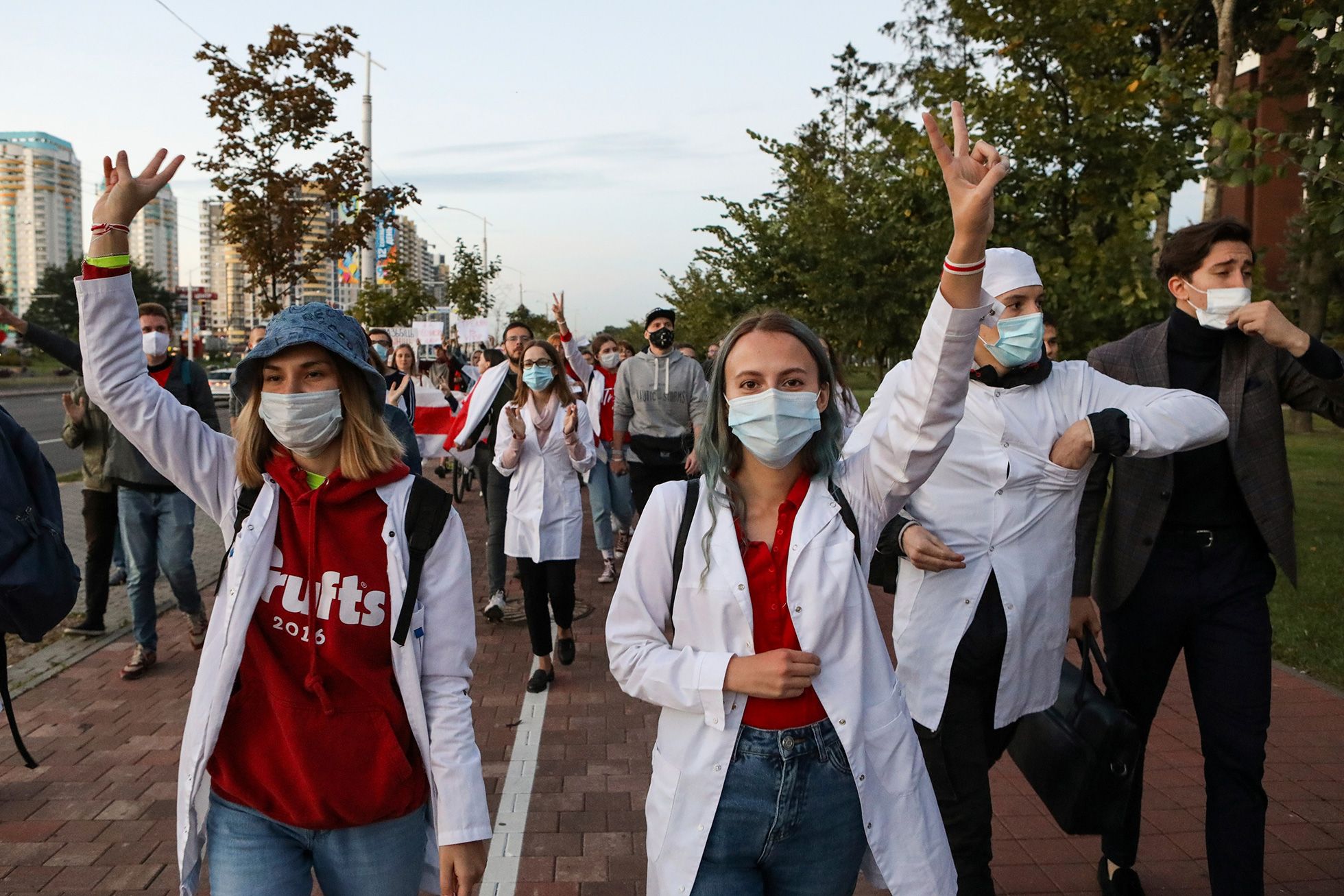 Протесты в Беларуси продолжаются уже больше трех месяцев. Настроенных оппозиционно к Лукашенко белорусов регулярно избивают, арестовывают и штрафуют на крупные суммы. В числе пострадавших как минимум несколько сотен медиков, утверждают общественные организации. Одновременно врачи пытаются бороться со второй волной пандемии коронавируса: только по официальной статистике, в стране ежедневно заболевает порядка 1500 человек. Сами медики говорят, что на деле заразившихся на порядок больше. «Медуза» рассказывает, как белорусское государство преследует медиков в разгар эпидемии.