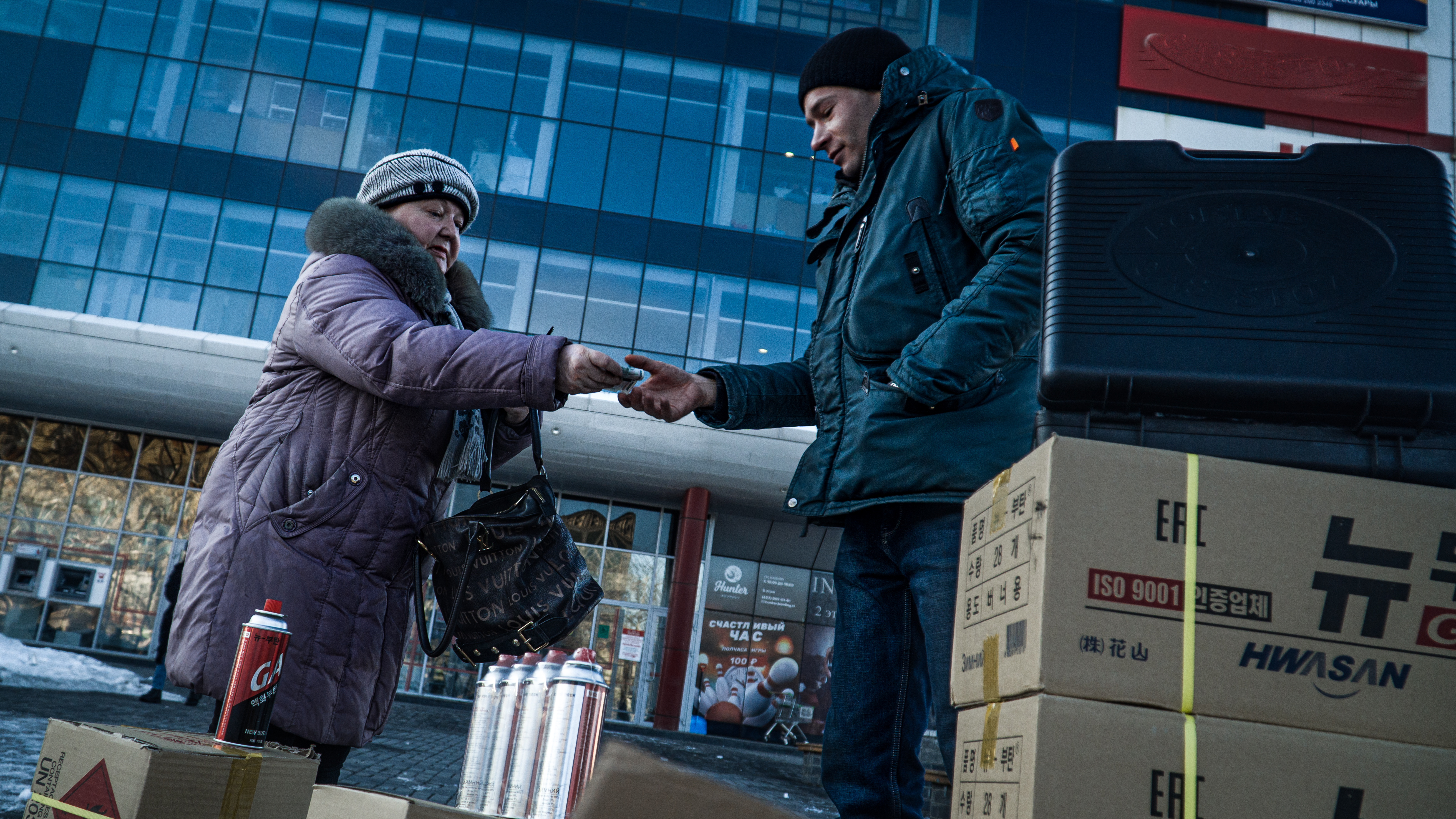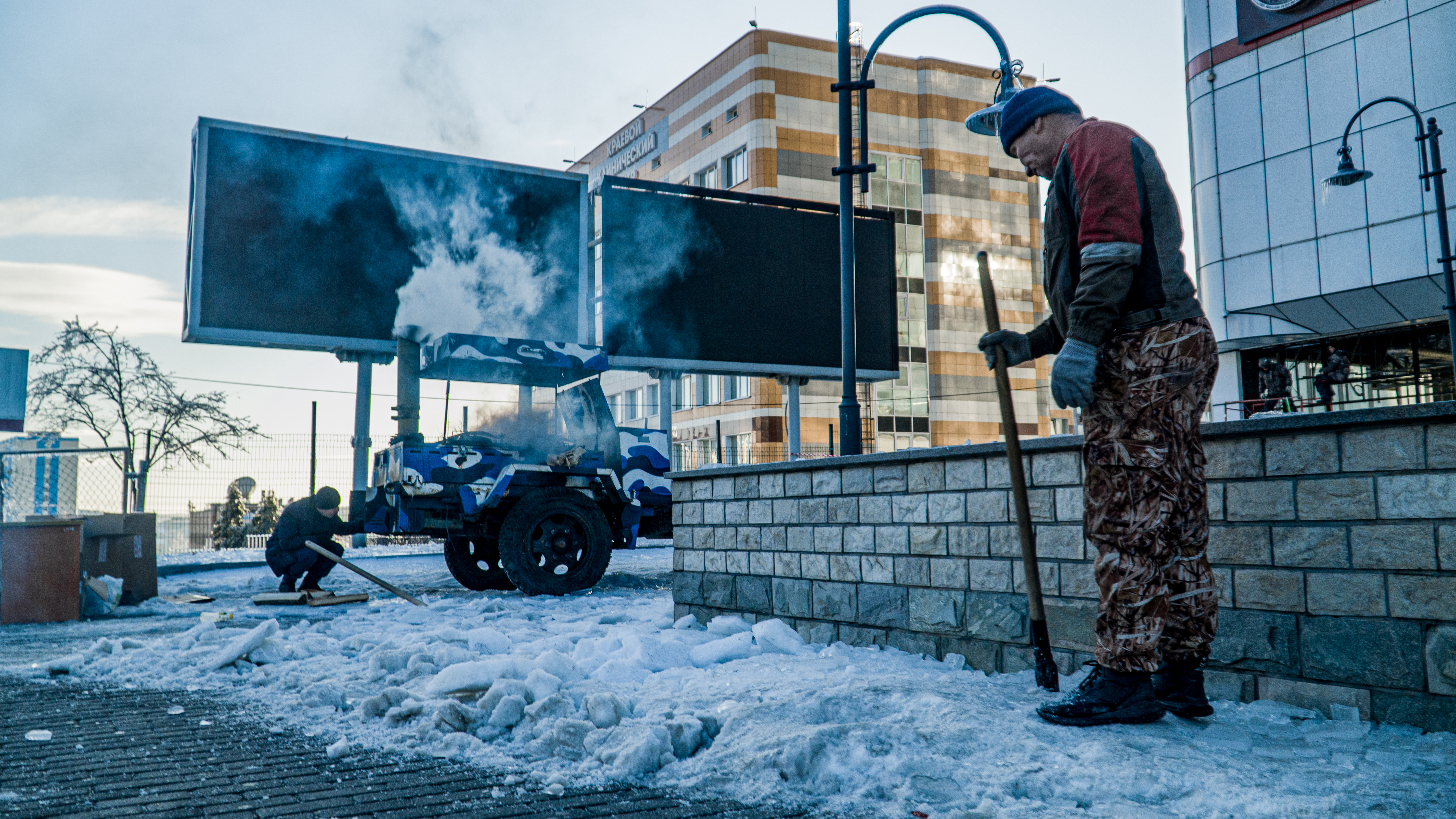 – Пенсионеры выходят к дверям медленно. Все закутаны в три-четыре слоя одежды. Кто-то радуется свечам, кто-то воде, кто-то хватает хлеб.