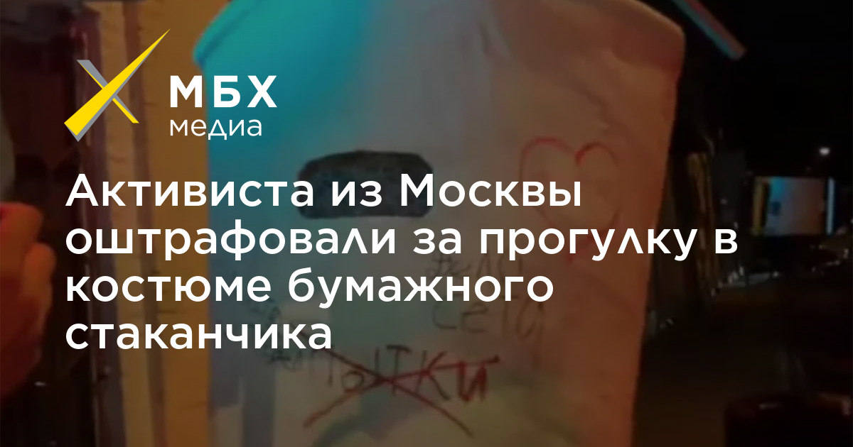 Мещанский районный суд Москвы оштрафовал на 10 тысяч рублей активиста «бессрочного протеста» Ивана Сажина за прогулку в костюме бумажного стаканчика. Об этом сообщает «ОВД-Инфо».