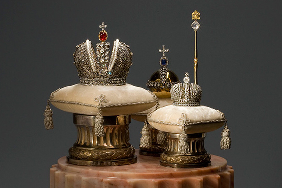 Среди экспонатов миниатюрная копия Императорских регалий, которая была изготовлена фирмой Фаберже для Всемирной выставки в Париже в 1900 году, и произведения знаменитой «императорской» серии пасхальных яиц, начавшейся в 1885 году с пасхального подарка Александра III своей супруге императрице Марии Федоровне.