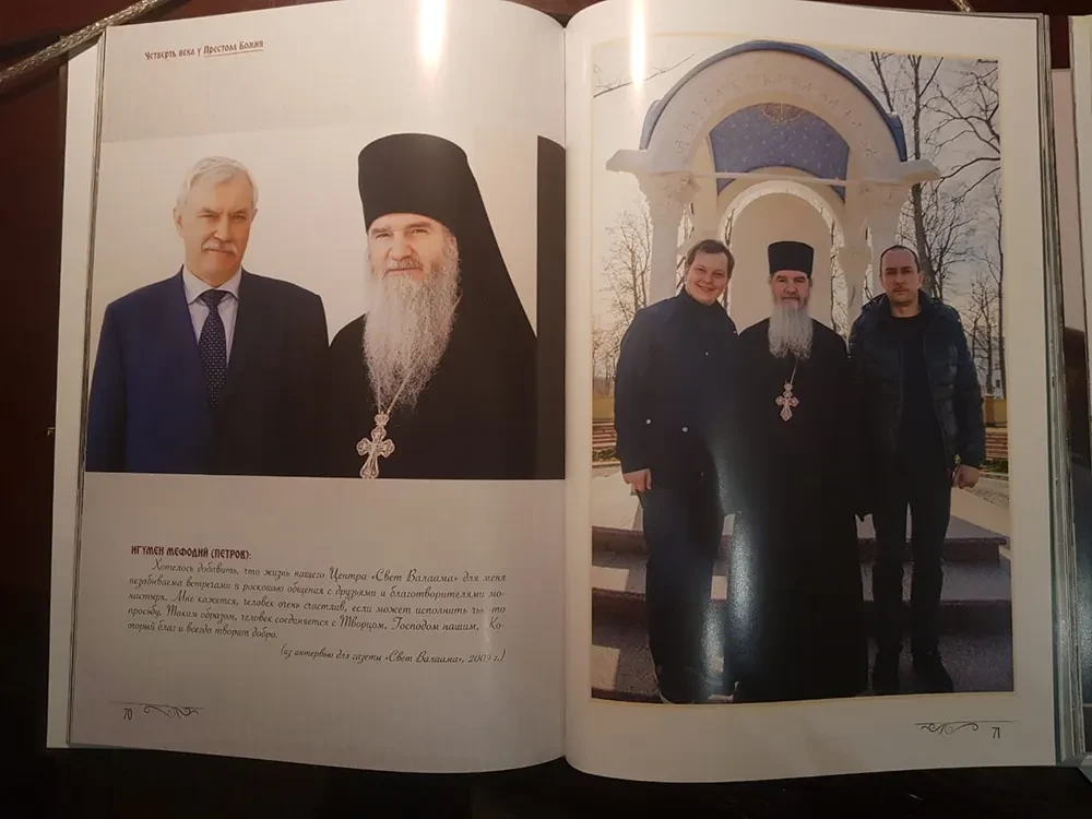 «Букову покровительствует архимандрит Мефодий, насельник Спасо-Преображенского Валаамского монастыря, — говорит Александр. — Это очень уважаемый человек, с именем которого связывают возрождение Валаама. Он занимается реставрацией, привлекает жертвователей, отвечает за связь с миром. Буков тоже является жертвователем, его имя на доске меценатов в Спасо-Преображенском соборе монастыря».
