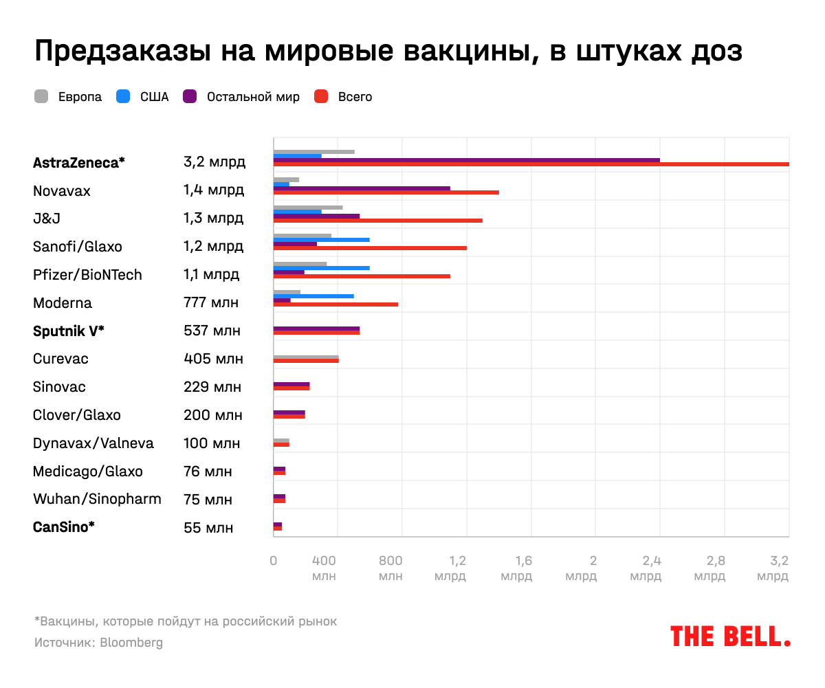 Если учесть объявленные планы самих фармкомпаний (Pfizer планирует выпустить до 50 млн доз вакцин в декабре 2020 года и до 1,3 млрд к концу 2021 года, а Moderna планирует в декабре 2020 года отдать 20 млн доз, и в 2021 году — от 500 млн до 1 млрд доз), получается, что в ближайший год мощностей американских производителей хватит только для того, чтобы покрыть западный рынок и другие единичные страны, также оформившие предзаказ. Среди последних — не только развитые Япония, Великобритания, Канада и Швейцария, но даже Перу, Коста-Рика, Эквадор и Новая Зеландия.