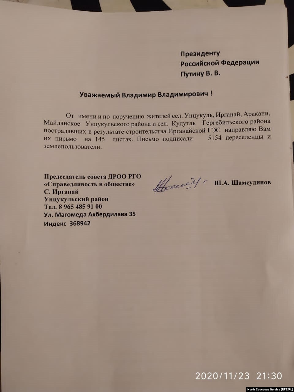 Жители Унцукульского и Гергебильского районов Дагестана написали письмо президенту России Владимиру Путину. Они требуют компенсировать им потерянное жилье и участки, которые были затоплены в 2008 году из-за запуска Ирганайской ГЭС. Под воду тогда ушли 1805 гектаров земли, ущерб в 2012 году был оценен в 9,5 млрд рублей, но компенсаций пострадавшие так и не дождались. Под письмом стоят подписи 5154 переселенцев и хозяев затопленных земель.