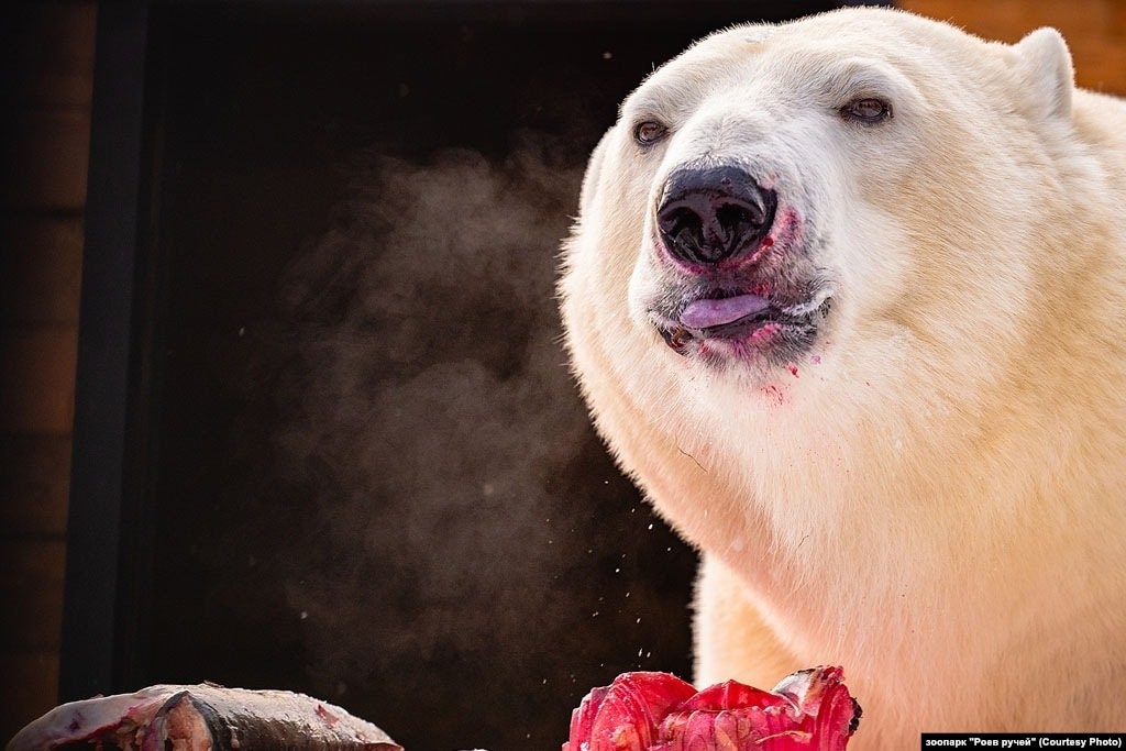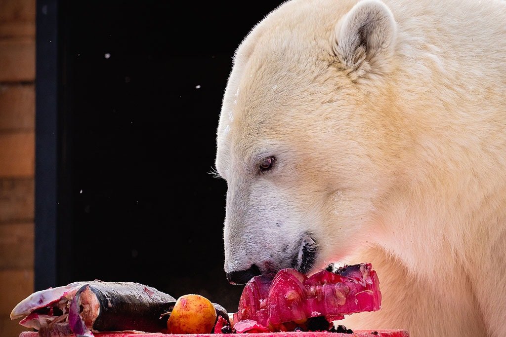 В честь наступившего медвежьего "праздника зимы" тортом накормили медведей Феликса, Урсулу и Марфу. Привычный для них уклад жизни с наступлением зимы изменился, хотя и не так, как это бывает у белых медведей в дикой природе. "Все лето у медведей парка "Роев ручей" заполнены водой бассейны. В бассейнах они спасаются от жары, купаются, ловят рыбу, которую им специально запускают живой. С наступлением холодов воду в бассейнах сливают, а на дно бассейна застилают толстым слоем свежей соломы", - объясняют сотрудники зоопарка.