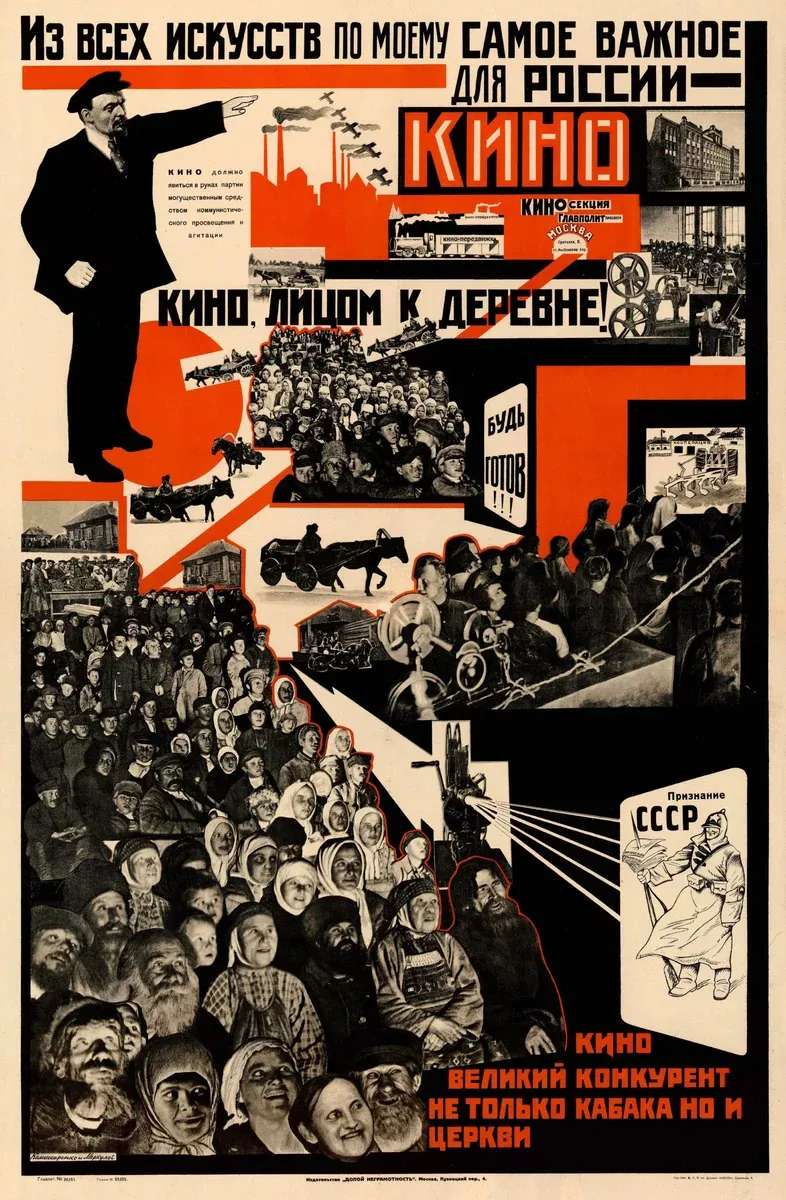 Не удивительно, что умный Ленин, захватив власть, быстро оценил воздействие этого зрелища на примитивного зрителя. По словам Луначарского, в феврале 1922 года он сказал, что «из всех искусств для нас (большевиков. — М. А.) важнейшим является кино» (в советское время эти слова в качестве лозунга украшали вход в каждый кинотеатр). Вождь пролетариата высоко оценил информационный потенциал кинофильма (лучше один раз увидеть, чем сто раз услышать). Стоило, например, заменить сыщика Пинкертона доблестным чекистом, и примитивная лента становилась мощным орудием пропаганды для неискушенного, плохо образованного зрителя.