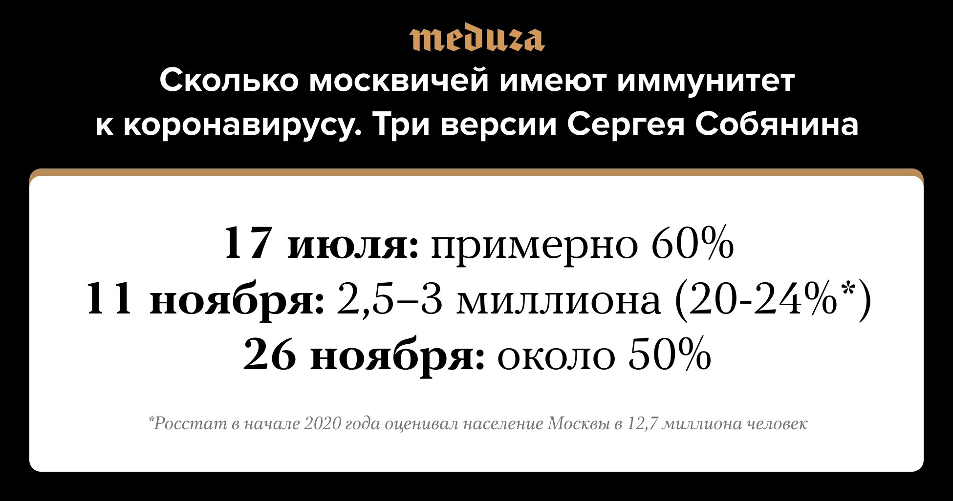 Сколько москвичей имеют иммунитет к коронавирусу. Отвечает (трижды) Сергей Собянин. В июле мэр Москвы был уверен, что коллективный иммунитет есть примерно у 60% населения — как в Нью-Йорке. 11 ноября оценка поменялась: теперь исследования показали, что иммунитет есть у 2,5–3 миллионов человек. Накануне число москвичей с иммунитетом, видимо, резко выросло.