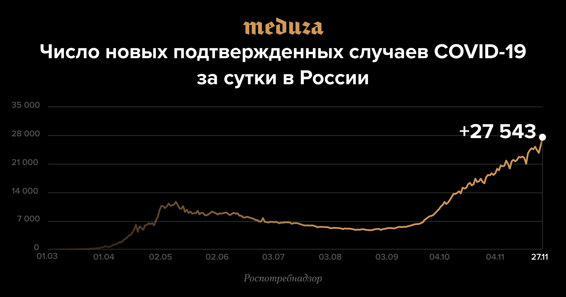 В России — новый максимум заражений за сутки: выявили 27 543 новых случая COVID-19. Больше заболевших в Москве — 7918 случаев, что стало максимальным суточным приростом в городе за все время. Всего с начала пандемии в стране заболели 2 215 533 человека. За сутки из больниц выписали 26 682 пациента с ковидом. За все время выздоровели 1 712 174 человека. За сутки умерли 496 человек, всего — 38 558 человек.