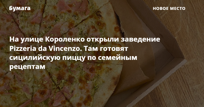 На улице Короленко, 3 — по соседству с The Red Corner на Некрасова — начала работу Pizzeria da Vincenzo, сообщили «Бумаге» создатели заведения. Это семейная пиццерия, основанная итальянцем Винченцо Драго и его женой Ириной.
