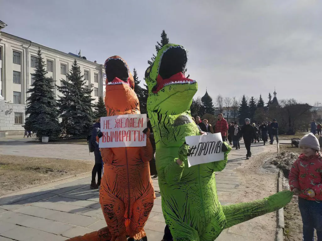 Протестующие против строительства завода «Титан-полимер» во Пскове в прошлом году пришли на акцию в костюмах динозавров с плакатами «Не желаем вымирать» и «Мы против». Они собирались выступить на митинге, но правоохранительным органам не понравилось, что костюмы активистов закрывали их лица. После беседы с полицией им пришлось покинуть митинг, что расстроило детей, которым очень понравились два персонажа доисторической фауны.