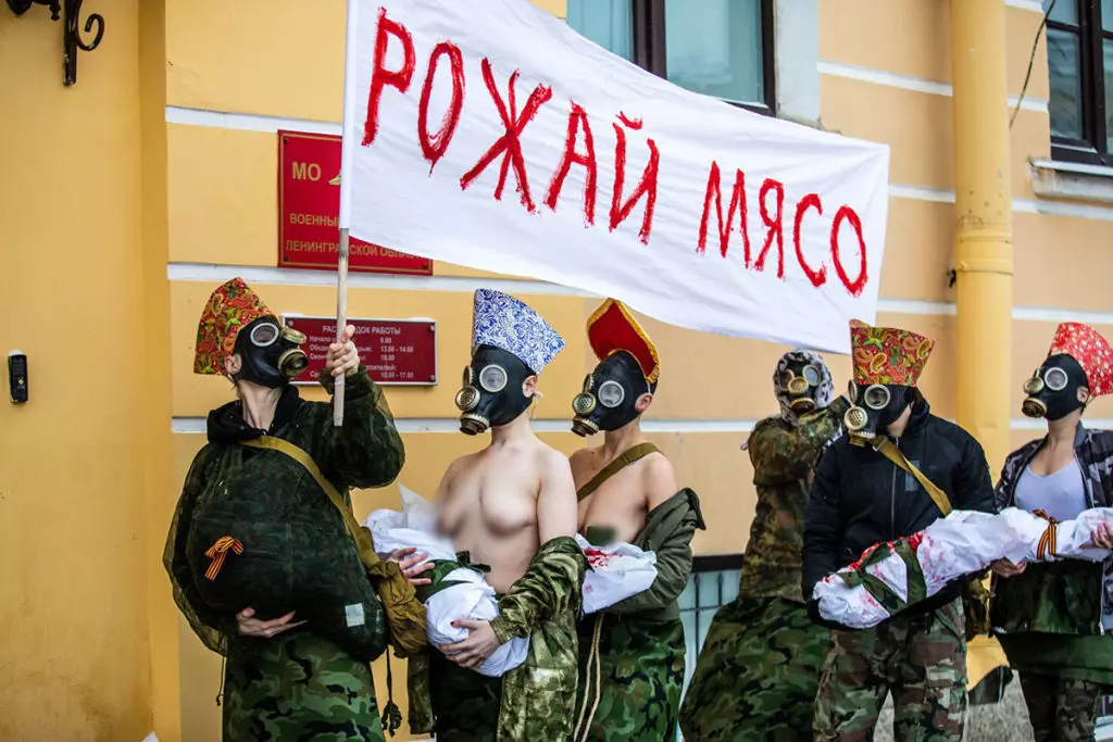В Петербурге активистки фемдвижения пришли к военкомату в военной форме, противогазах и кокошниках. В руках они держали конверты с детьми — только вместо младенцев в пеленки было завернута сырая говядина. Две участницы держали в руках плакат «Рожай мясо». Так они выступили против давления на женщин и насилия над мужчинами, которые не хотят служить в армии, а также против возможного запрета на аборты. Акция проходила 23 февраля 2019 года.