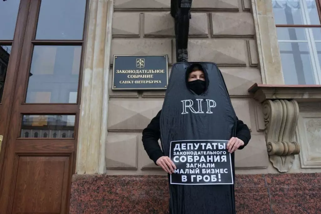 Активист пришел к зданию петербургского законодательного собрания в костюме гроба и плакатом «Депутаты законодательного собрания загнали малый бизнес в гроб». Так он выразил поддержку малому и среднему бизнесу в городе. Сотрудники полиции задержали активиста и двух редакторов телеграм-каналов, которые освещали акцию.