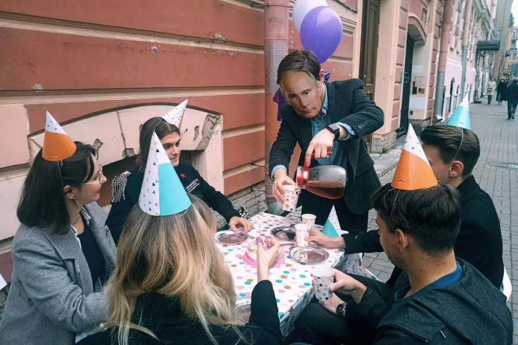 7 октября, в день рождения Владимира Путина активисты движения «Весна» отпраздновали «нулевой» юбилей руководителя государства — так участники акции откликнулись на законодательное «обнуление» президентских сроков после принятия поправок в Конституцию. Активисты встретились у стен петербургского дома на Басковом переулке, где раньше проживал Путин, и устроили там чаепитие прямо на тротуаре — ели торт и пили чай. Один из участников был в маске с изображением Путина, а другие — в колпаках.