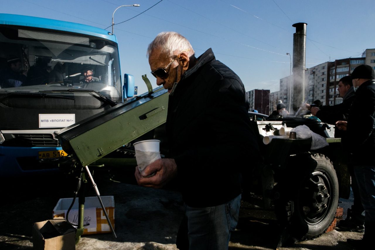 В районе Чуркин для жителей развернули полевые кухни, где люди могли поесть горячей еды и попить чаюФото: Наталья Булкина Горожане практически единодушны во мнении: если они не самоорганизуются, чтобы спасти самых уязвимых, те погибнут. Они стали помогать друг другу сами. В наиболее пострадавший район — Первомайский (который все называют Чуркин — по названию мыса, на котором он расположен) — стали выходить волонтеры. Один из них, Валентин Сиденко, вместе с женой с утра до вечера возит по заблокированным в квартирах людям еду, воду и газовые плиты. Сначала они планировали разовую акцию, но, увидев, в каком состоянии земляки, остановиться не смогли.