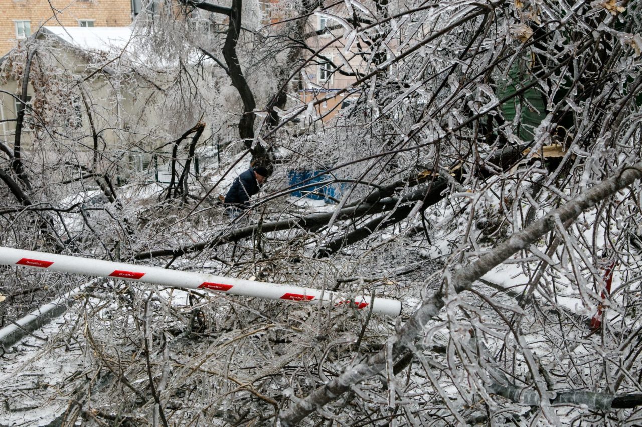 Дерево-«леденец»Фото: Наталья Булкина Неясно, куда смотреть, когда идешь по улице: вверх — поскользнешься и ударишься об лед, вниз — пропустишь летящую сверху глыбу льда от остатков проводов линий электропередачи, с деревьев или крыш. На глазах у местной жительницы под обвал льда с крыши многоэтажки чуть не попали дети на детской площадке, после чего она предусмотрительно отколола 20-килограммовый кусок наледи со своего кухонного откоса и призвала земляков сделать то же самое.