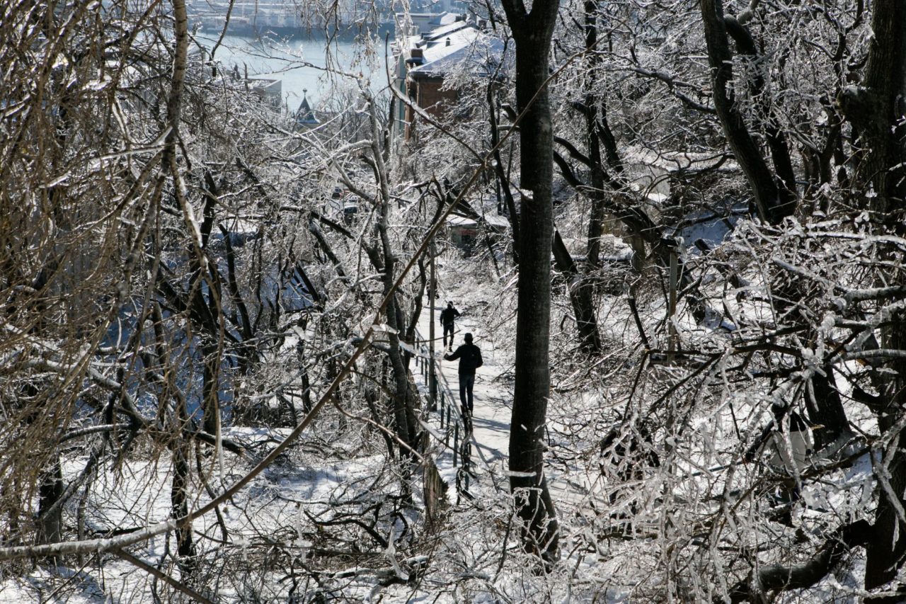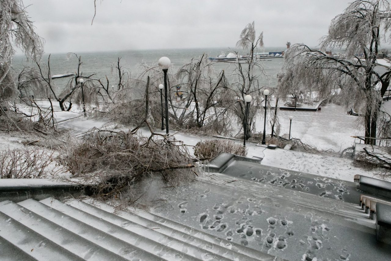 Наутро жители города обнаружили себя как будто в фильме-катастрофе «Послезавтра»: абсолютно все было покрыто толстой коркой льда. Деревья, словно закованные в хрусталь, звенели на ветру; заблюренные льдом машины превратились в тыквы; тротуары, лестницы, перила, даже стены домов — все ушло под лед. Опоры ЛЭП под слоем замерзшей воды упали, как карточные домики, утянув за собой километры проводов.