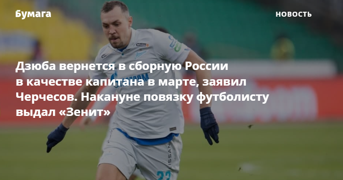 Нападающий «Зенита» Артем Дзюба вернется в сборную России по футболу в качестве капитана. Такое заявление сделал главный тренер команды Станислав Черчесов, сообщает ТАСС.