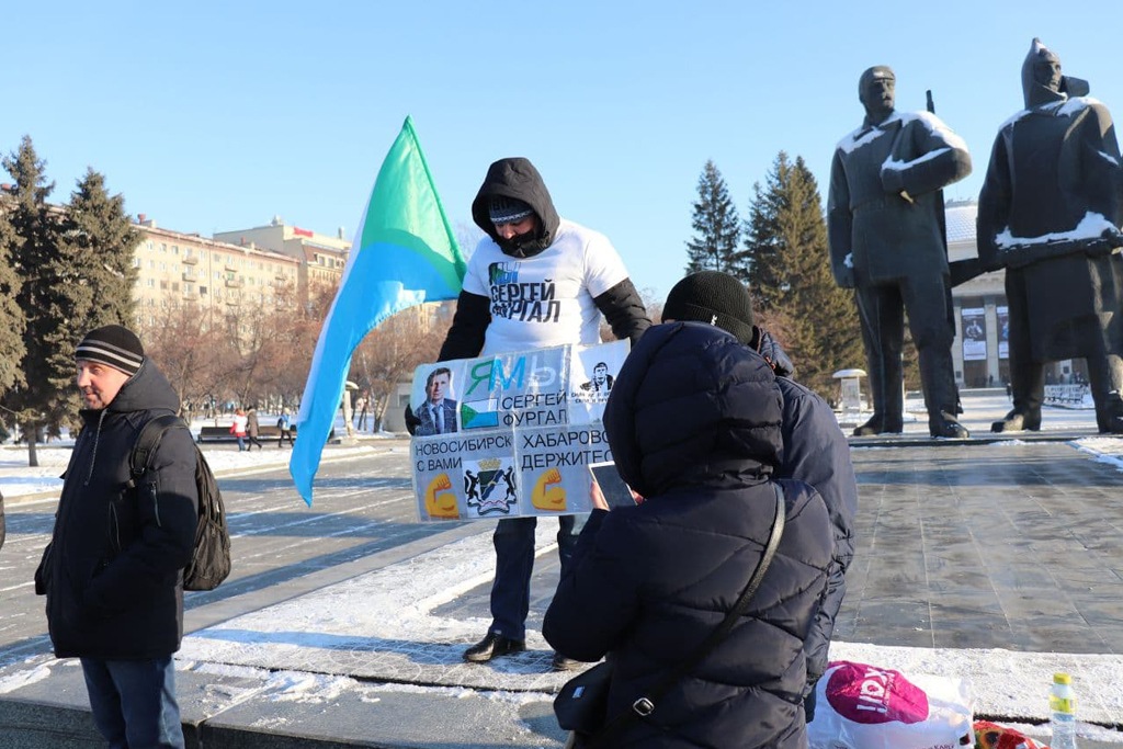 В поддержку хабаровчан выступила и активистка Яна Дробноход, которую суд оштрафовал на 300 тыс. рублей за предыдущие акции. Она вновь вышла на площадь Ленина с плакатом в поддержку хабаровчан.