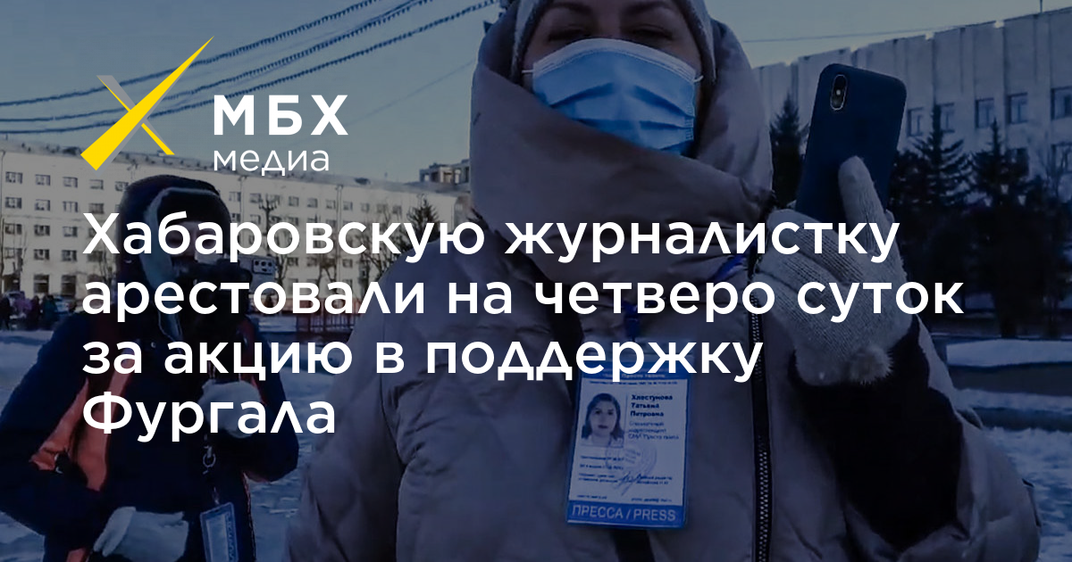 Индустриальный районный суд Хабаровска арестовал на четверо суток журналистку «Просто газеты» Татьяну Хлестунову за акцию в поддержку экс-губернатора Сергея Фургала. Об этом сообщает «ОВД-Инфо», а также пишет местный штаб Алексея Навального.