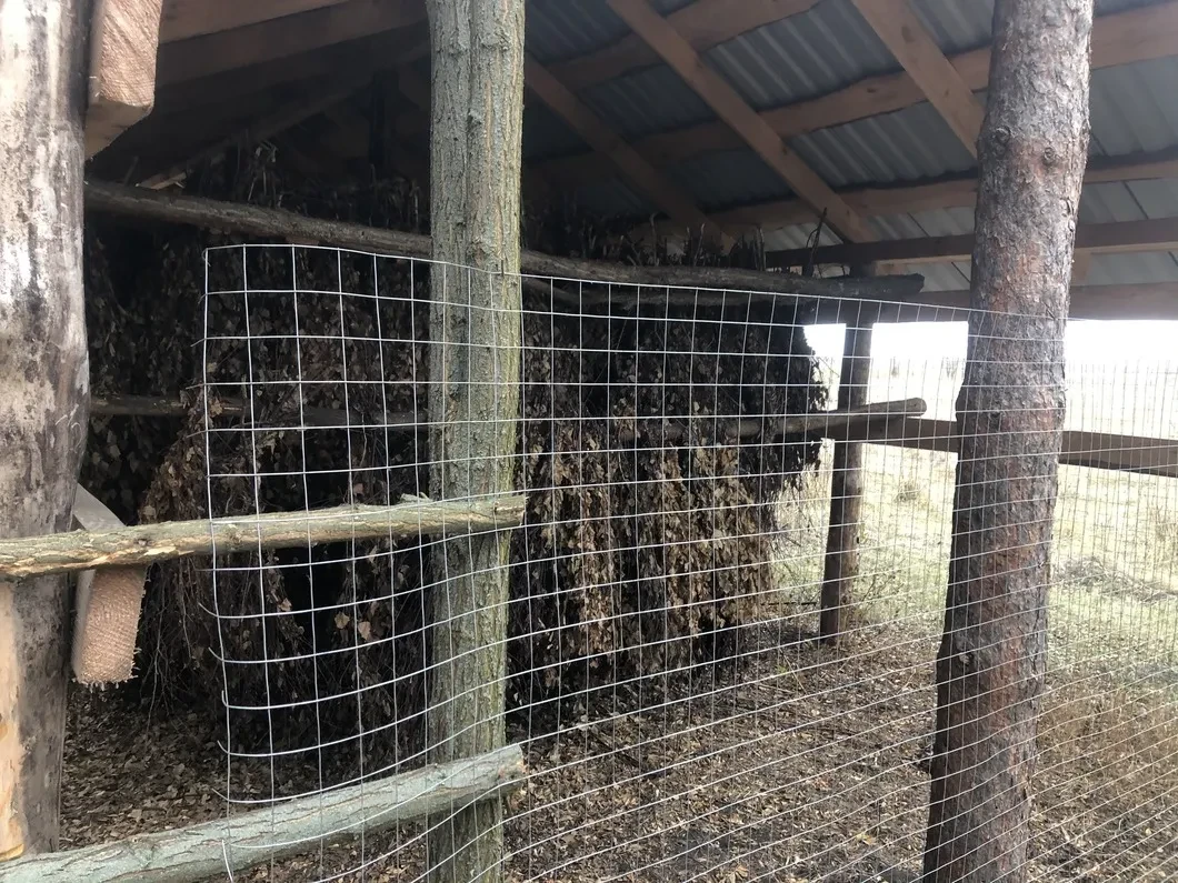 Рядом с полем большой сарай, обнесенный сеткой, — хранилище для веников. Сотрудники парка срезают и заготавливают их, предварительно вымочив в соляном растворе. Соль — важный элемент в рационе копытных. Соленые веники очень нравятся оленям, даже больше, чем свежая зелень. Сарай пришлось обнести сеткой, после того как они вломились внутрь и объели запасы. Вокруг хранилища еще видны следы «преступления».