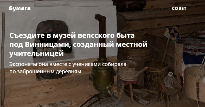 В поселке Курба под Винницами есть небольшой музей вепсского быта, созданный местной школьной учительницей Светланой Ивановной Ершовой. Дорога из Петербурга туда займет около 5 часов, ее можно совместить с путешествием по окрестным деревням или к Онежскому озеру.